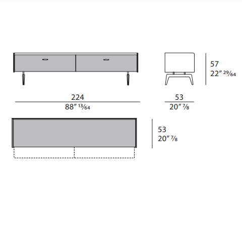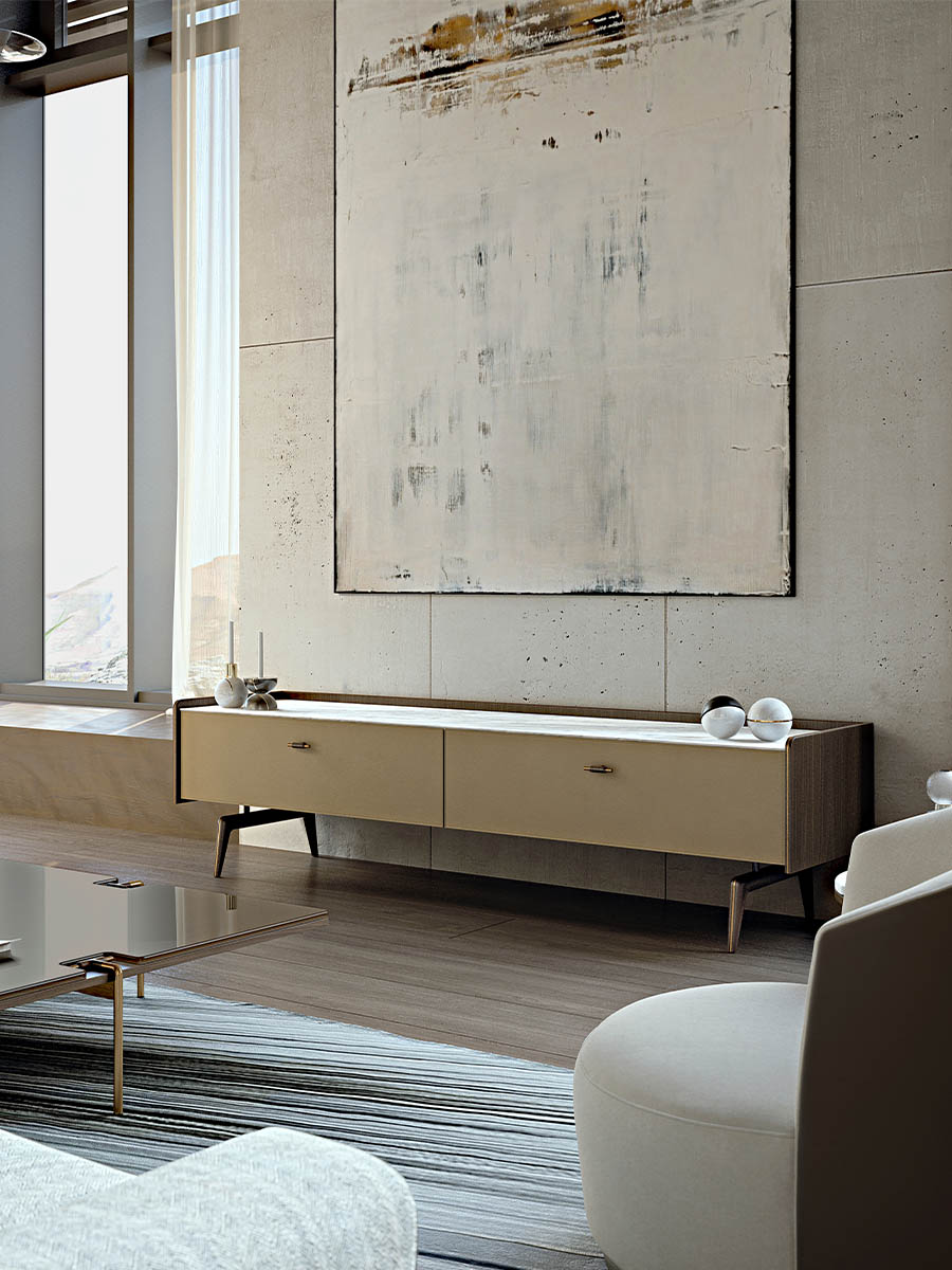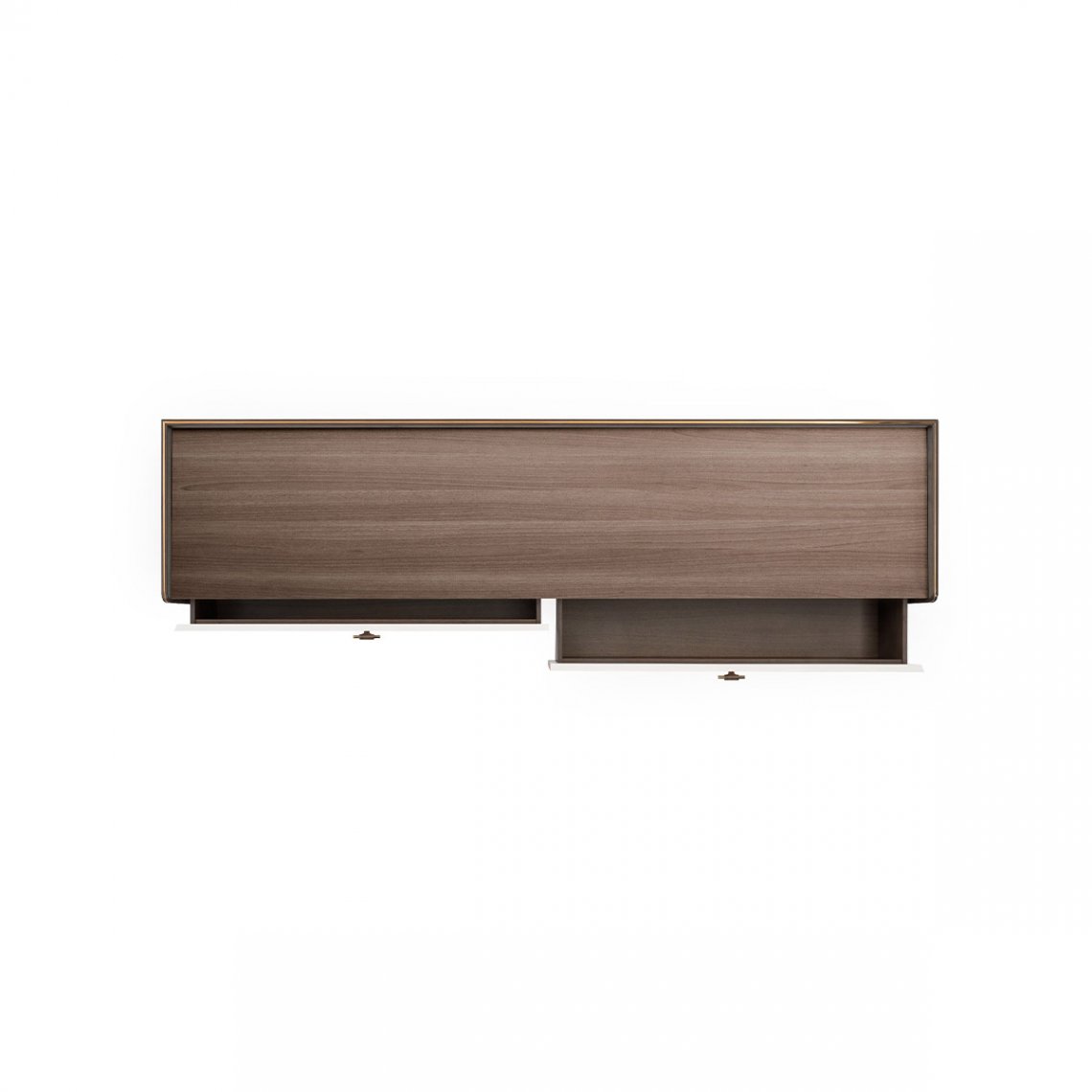 The Blues TV cabinet is designed to be highly customizable. The walnut wood structure supports two drawers whose fronts can be made of natural wood, leather or glossy lacquered wood. The top can be produced in natural wood, leather or precious marble. The Blues tv unit is available in different finishes as per sample books.