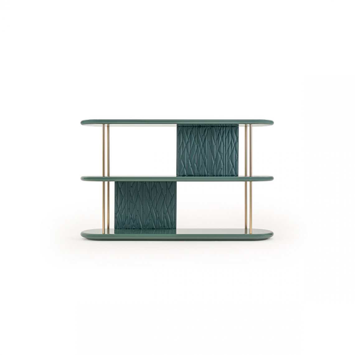 The shelves of the etagere, made of single-color glossy lacquered wood, are vertically interspersed on the back with padded panels that can be lined in leather and embroidered. The vertical metal structure of the etagere is available in two finish variants. The etagere roma Roma is available in different finishes as per sample card.