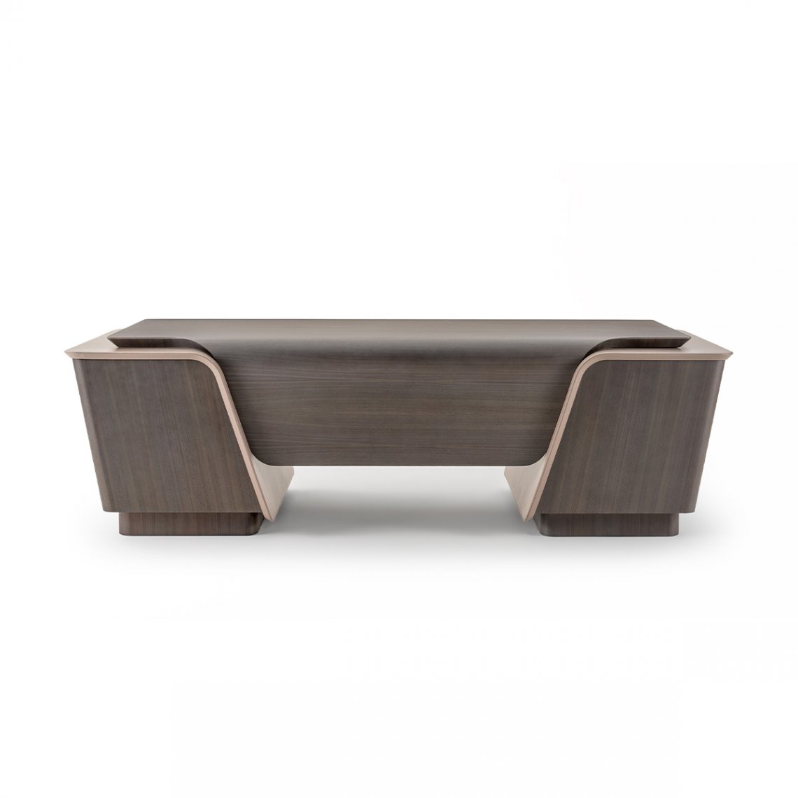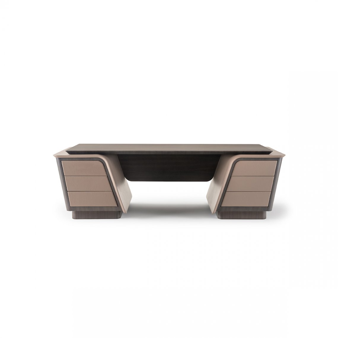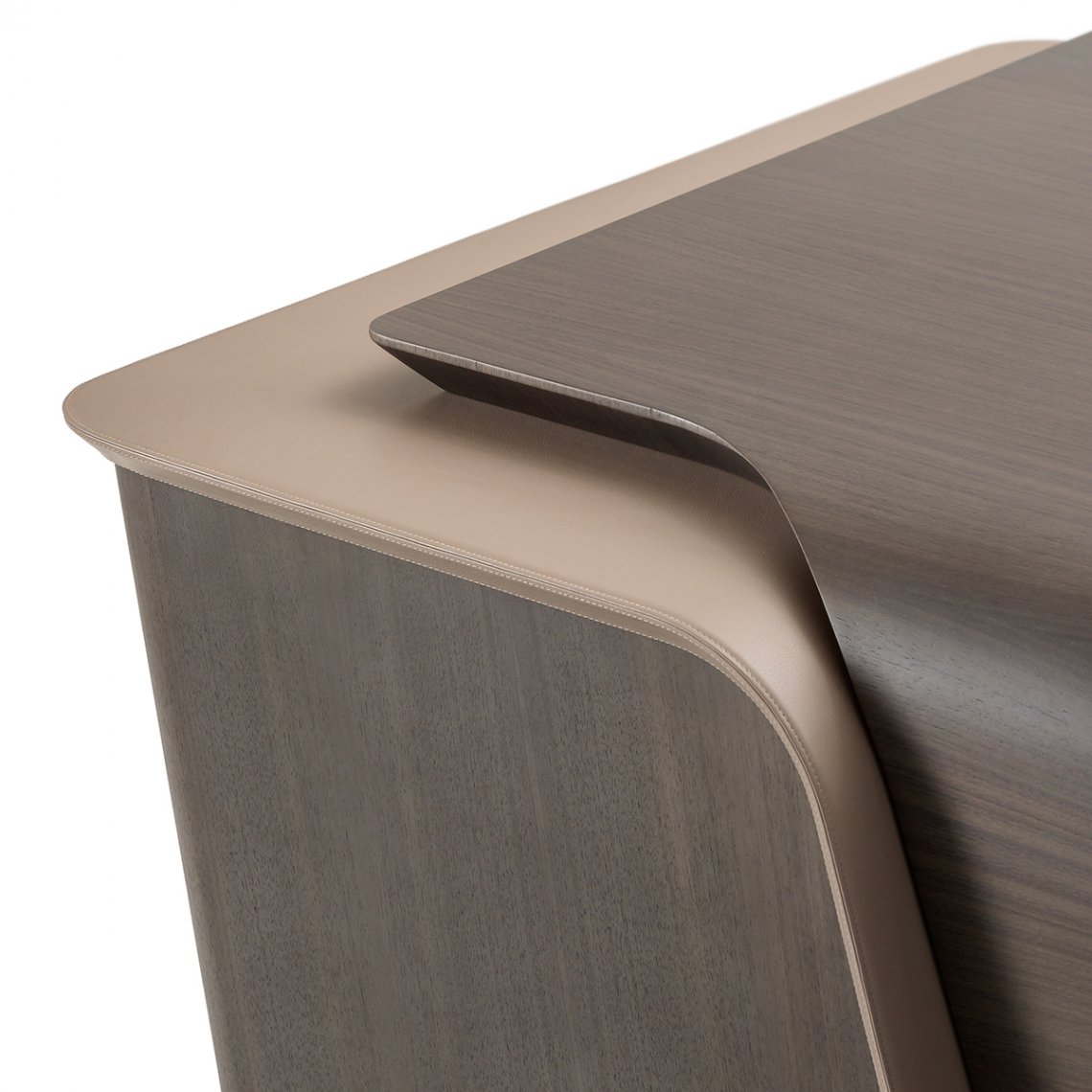 The Blues desk has an important structure and an original formal aspect. The processing of leather and walnut wood is the real protagonist. The legs of the desk are equipped with drawers covered in leather. The Blues presidential desk is available in different finishes as per sample card.