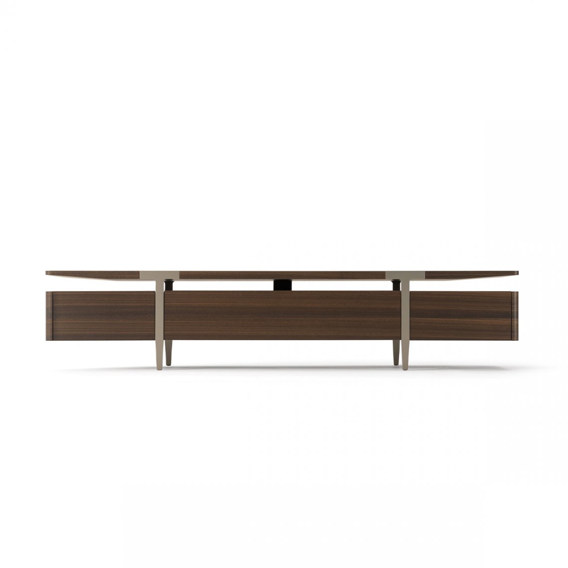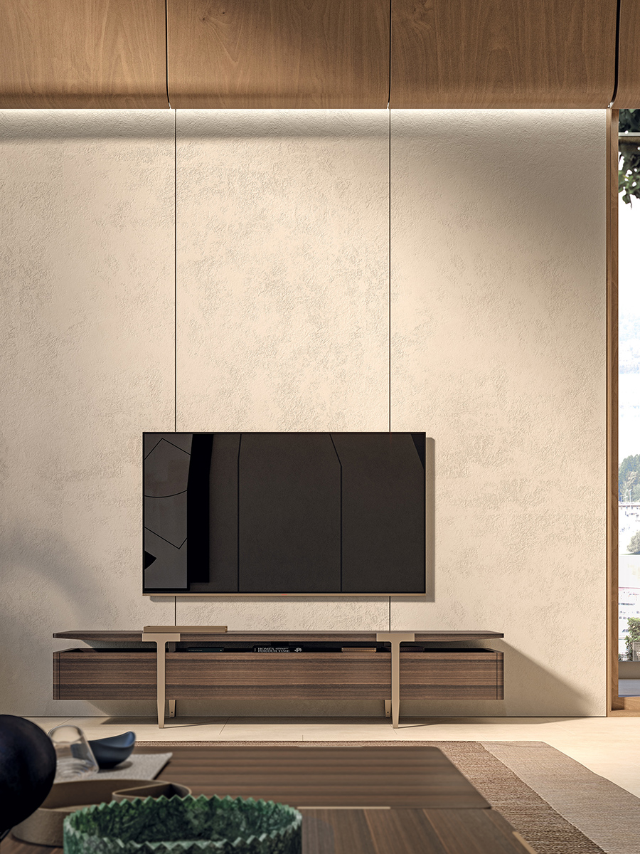 The slim and thin Tv unit of the Domus collection, in Eucalyptus wood with metal legs, is characterized by a raised top, two doors on the sides and a flap door in the center. The Domus Tv unit is available in different finishes as per sample card.