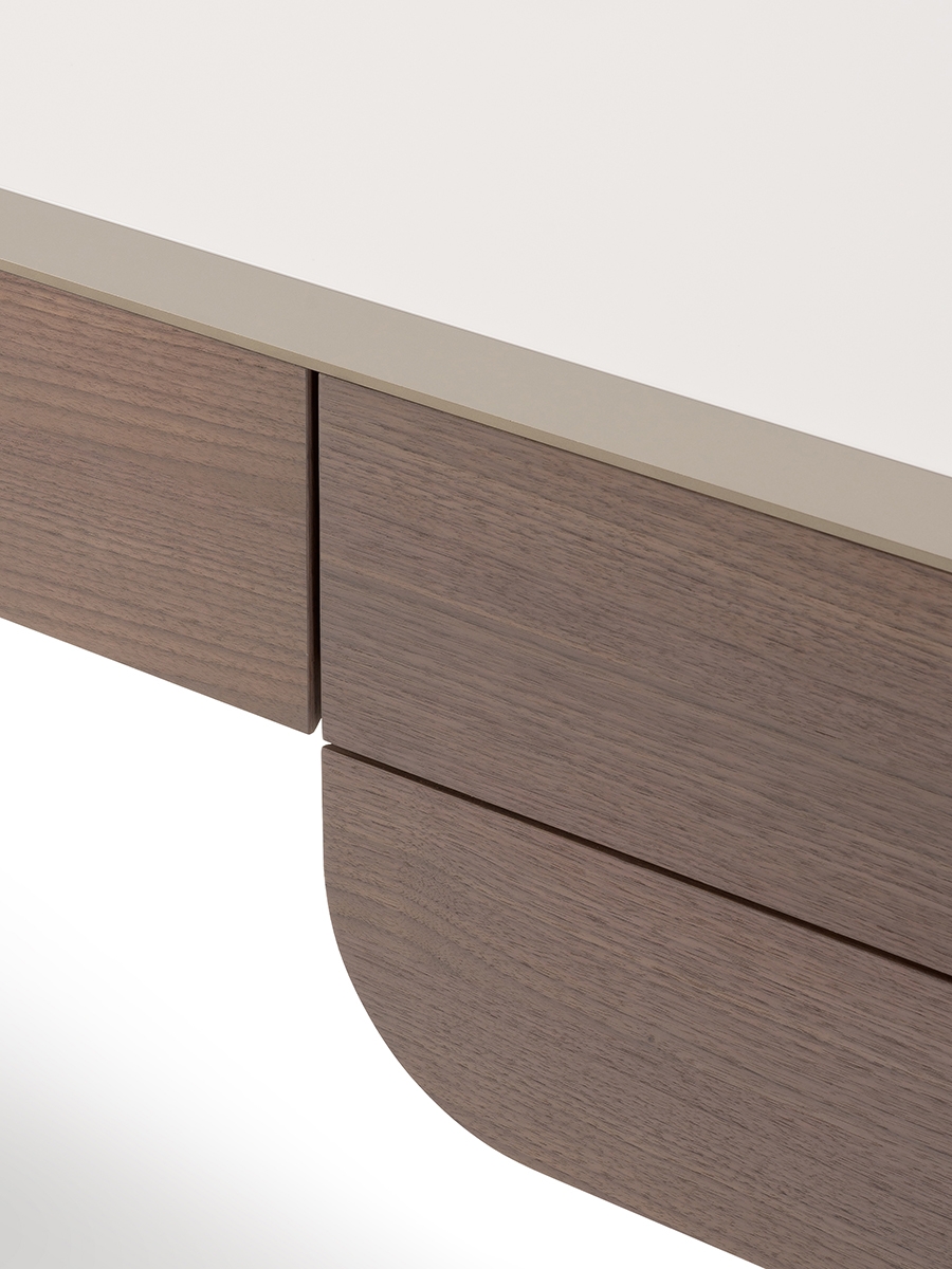 The lacquered wooden top with metal edge of the dressing table from the Soul collection finds its continuation in the linearity of the walnut legs. The presence of the front drawers in wood or marble makes the toilet an essential and functional product for the storage of tricks and objects. The Soul dressing table is available in different finishes as per sample card.