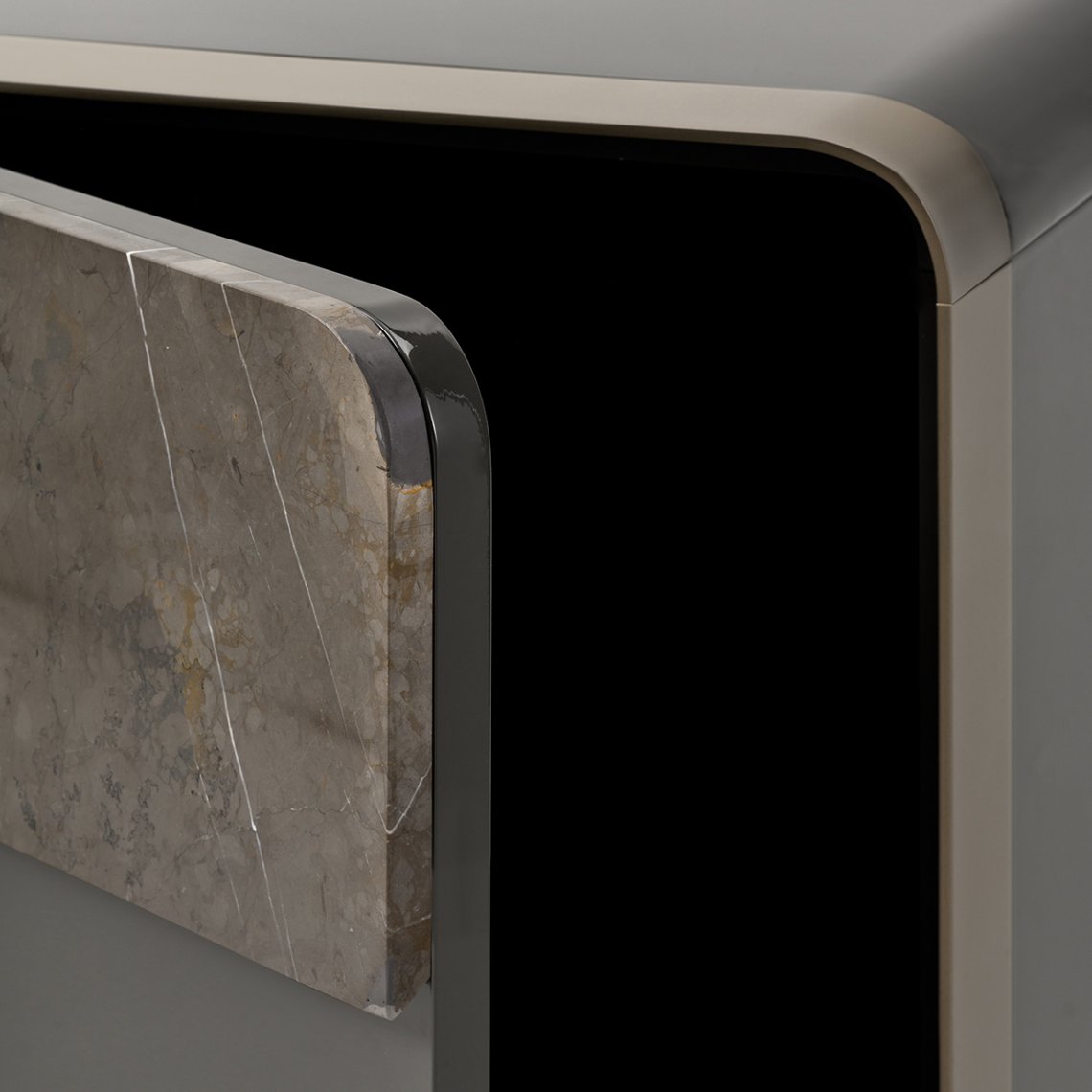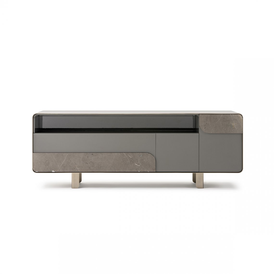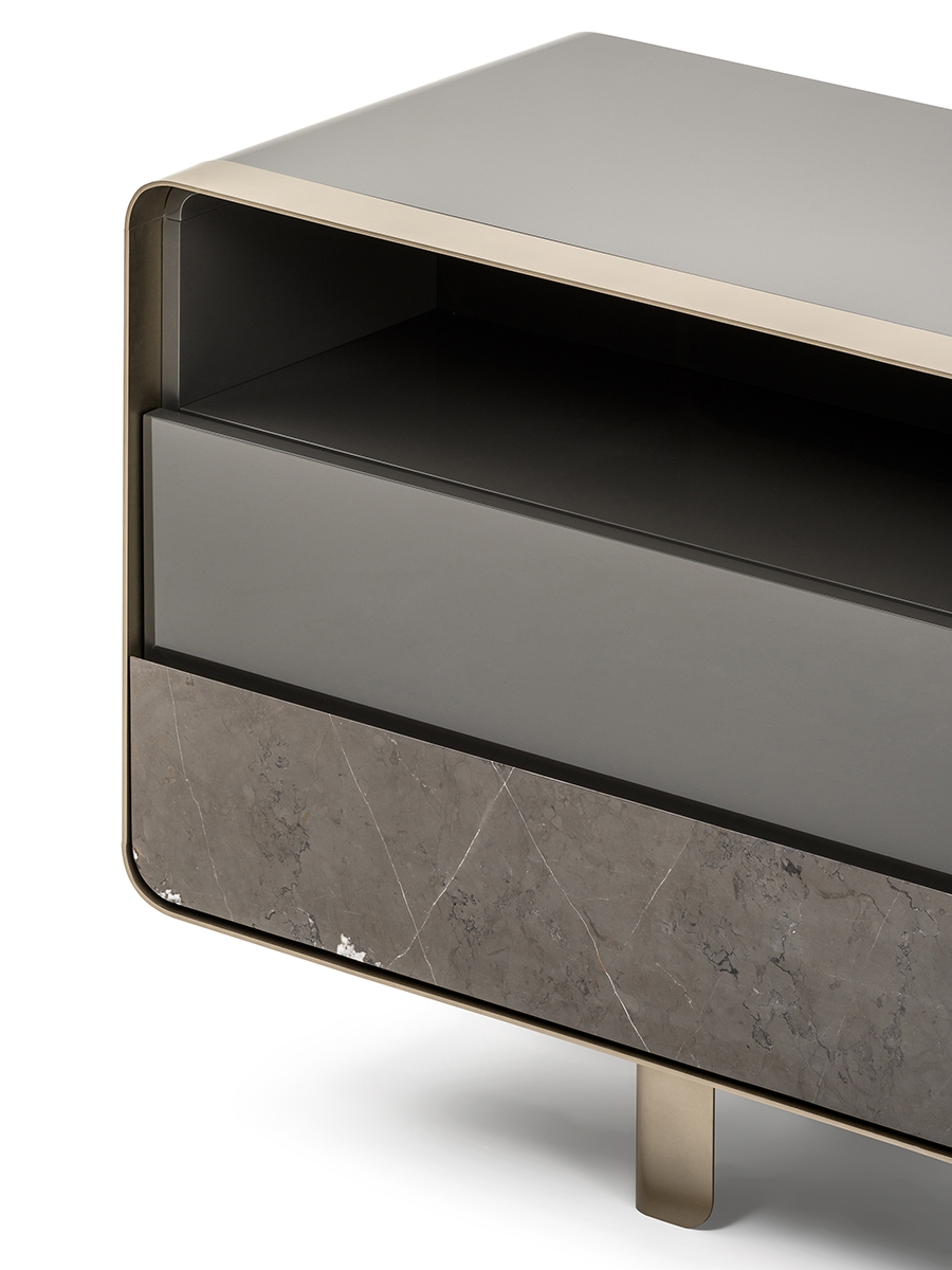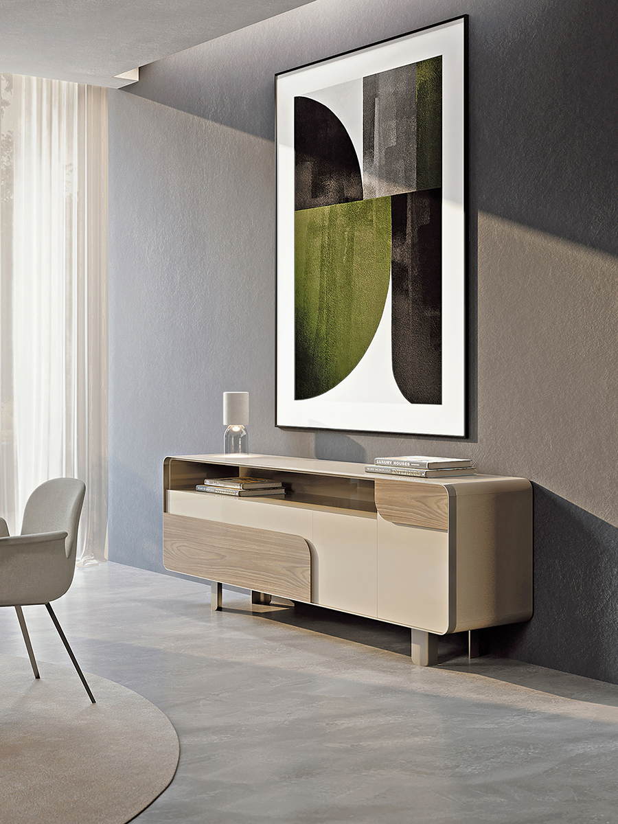 The sideboard of the Soulcollection shows a particular metal frame that outlines the front and makes the suspension stand out from the ground, made possible by sophisticated feet in folded sheet metal, which reflect the rounded taste of the front frame. The sideboard is equipped with a chest of drawers and two doors inside which it is possible to store objects and tools of various kinds. The sideboard of the Soul collection is available in different finishes as per sample card.