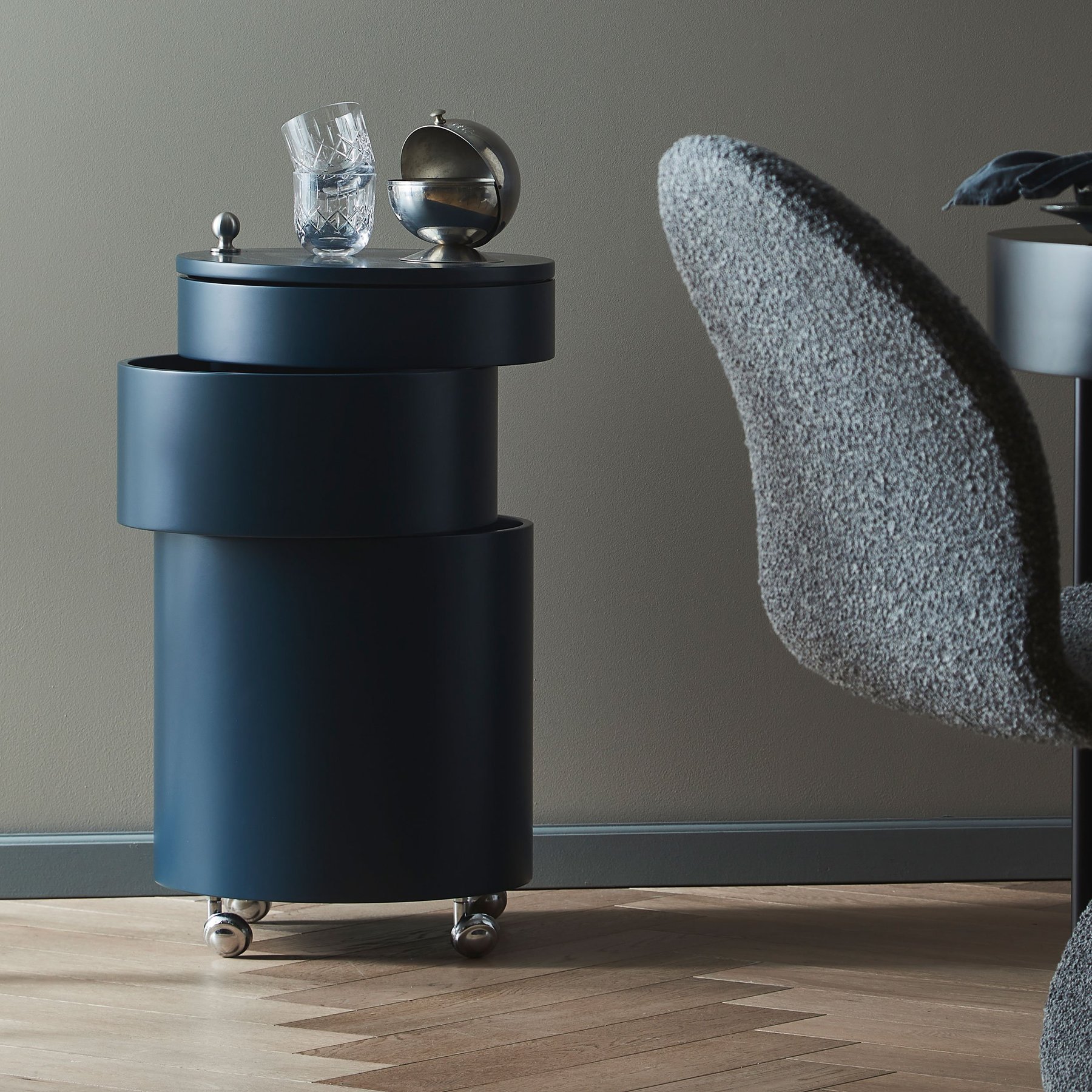 Adaptable side table and mobile storage unit in one. Barboy consists of three oval-shaped drawers, which can be pulled out fully so the whole surface can be used. Barboy is a typical example of Panton’s furniture, in which he combines a matt surface with a shiny chrome handle and wheels, investing the piece with an elegant contrast.