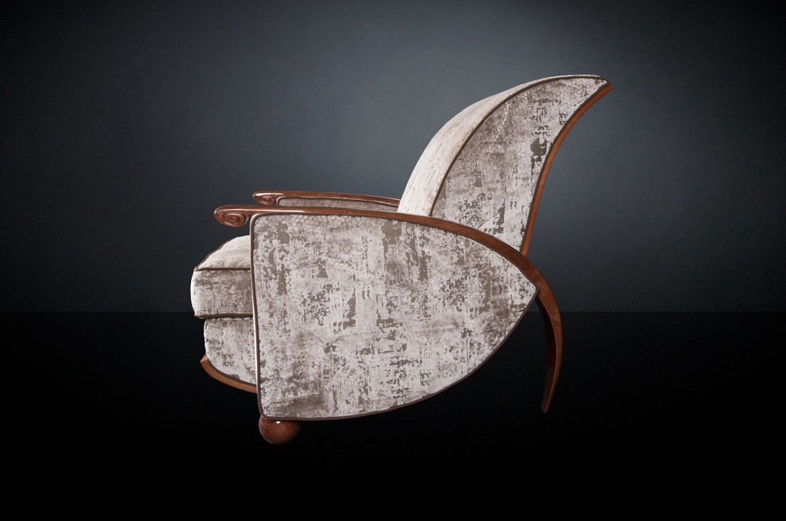 Classic armchair handcrafted by Venetian artisans, restyled by Slow+Fashion+Design for VG inspiring to antique Fortuny fabrics and Japanese shibori art. The choice of alternated textured inserts was inspired by the Yin & Yang philosophy, so that the two armchairs would complement one another.