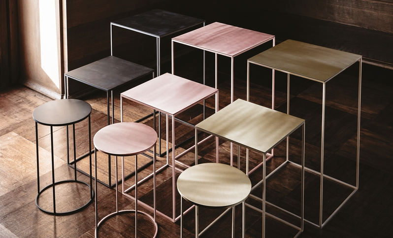 Vibieffe 9500 side tables 100, 101, 102 are a series of square or round metal tables with different sizes and heights, which can be freely combined.