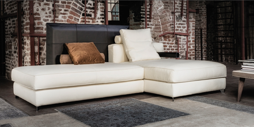 415 Tube is an extremely customizable sofa with both a traditional and innovative feel, both opulent and minimalist, and it can be combined into different variants by choosing single elements with different sizes along with corner and end elements, stand-alone sofass, chaise-longues, ottomans and panels that can be freely assembled. Armrests can take the shape of metal rolls covered with leather.