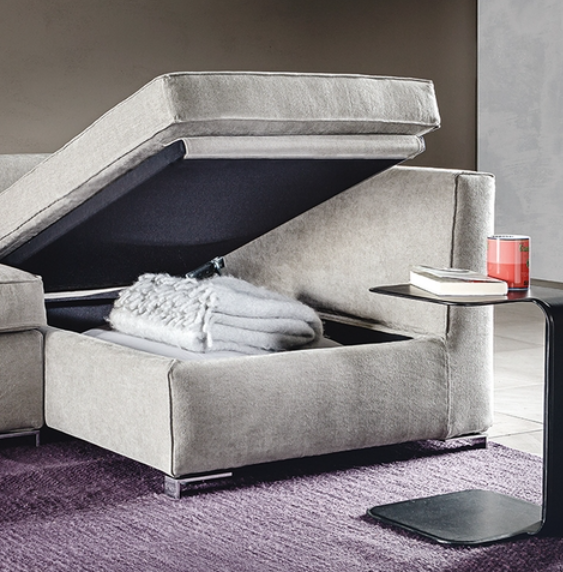 Vibieffe 2800 Bel Air is a modular two-seat sofa bed with chaise-longue and storage space, available with completely removable covers in cotton, linen, leather or with custom covers.