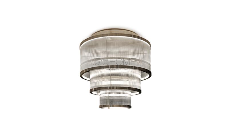 Chandelier in glass disposed on 3 levels. Main structure in steel and satinized brass, chrome or gold fifinishing, with faceted edges and sides in grooved glass. Warmlight LED bars integrated in the structure. Ceiling cup in satinized steel with adjustable suspension in steel wire cable, max 220W in total, weight 90 kg.