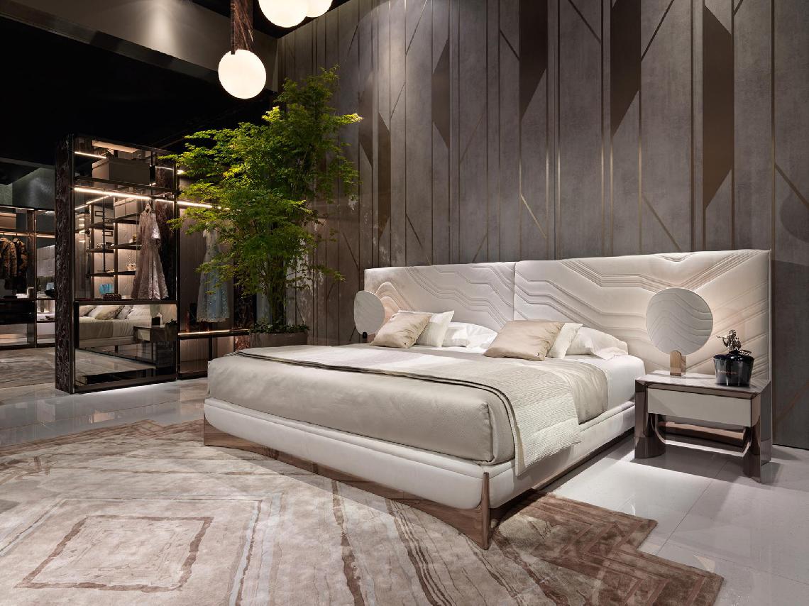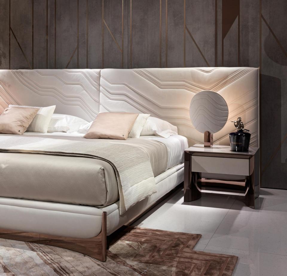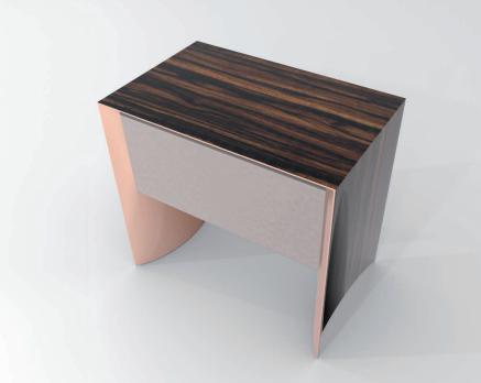 Bedside table in wood with concave sides in veneered wood or lacquered with 100 gloss hand-lacquered finish. Internal frame in curved stainless steel. Drawer with front panel upholstered in leather or fabric, internally lacquered in matt RAL colours.
