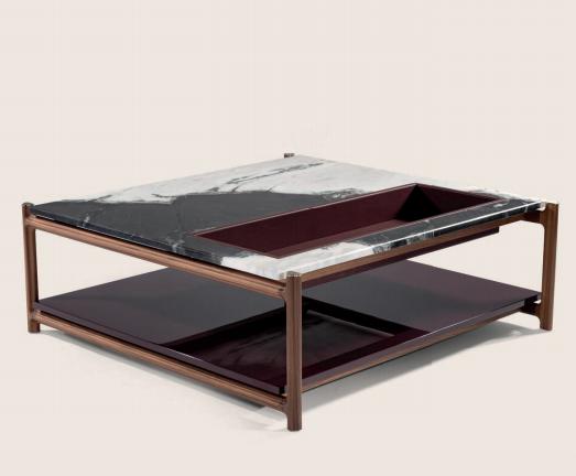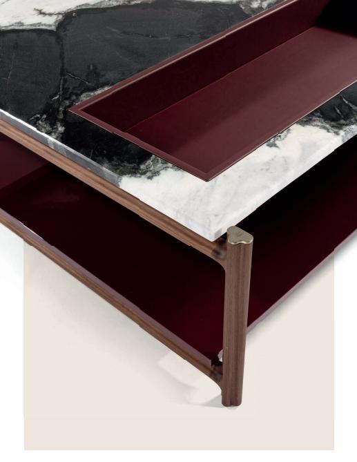 Low table, main structure in carved Canaletto walnut solid wood, lower shelf in shiny lacquered wood or upholstered in leather or fabric. Marble top available with storage tray upholstered in leather or fabric.