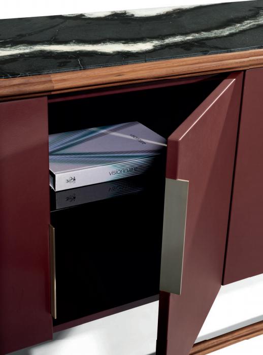 Low unit with curved lateral sides, external structure in carved Canaletto walnut solid wood, internal structure in wood with doors and sides finished with lacquering or leather or fabric upholstery. Handles in metal. Internally lacquered in matt RAL colours. Built-in top in marble. Available with internal LED light.