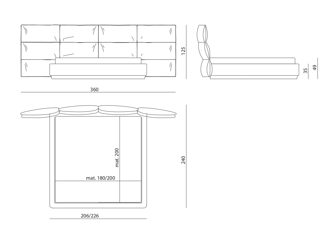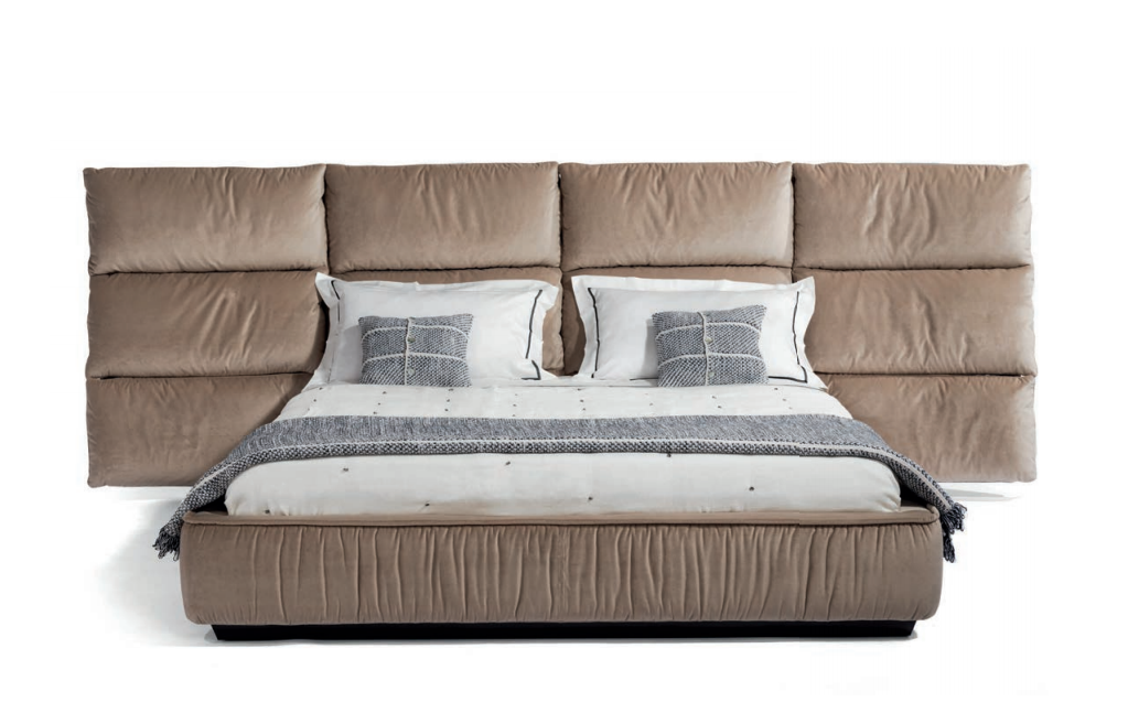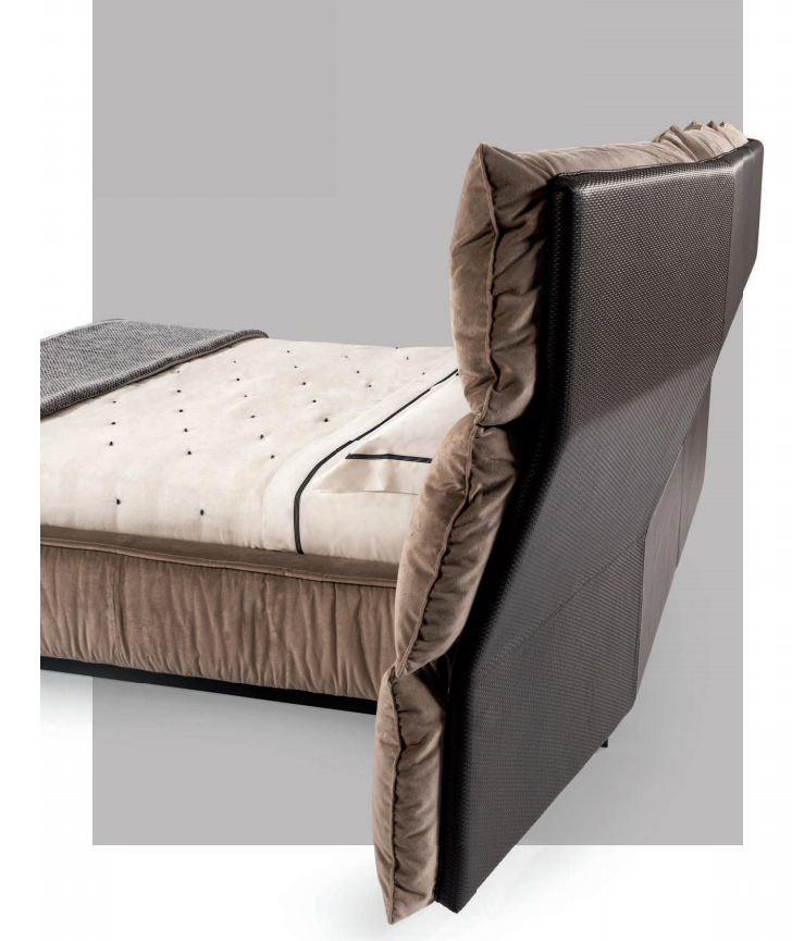 Bed upholstered in leather or fabric. Headboard consisting of twelve pillows in feather, supported by an embracing-shaped wooden structure upholstered in leather or fabric. Upholstered bedframe with matelassé effect. Base in steel-coated wood.