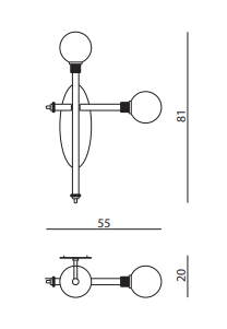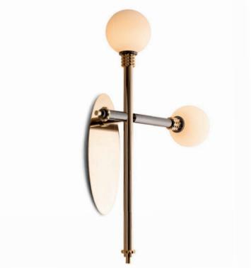 Floor lamp and wall lamp in brass and blown glass. Tubular structure in brass with bicolour finish and rings in carved solid brass. Spherical light diffuser in blown glass with satin opaline finish.