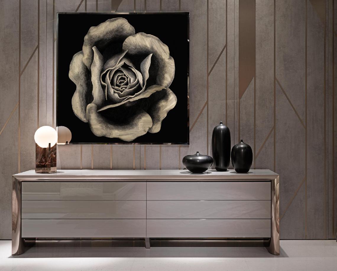 Table lamp in marble and steel. Structure in metal with lowrelief stripes decoration and central part coated in marble. Round light diffuser in blown glass with satin opaline finish.