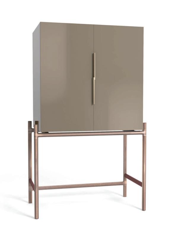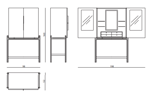 Make-up unit, main structure in carved Canaletto walnut solid wood, cabinet in wood with 100 gloss lacquered finish and metal handles. Inside in lacquered wood with three mirrors, a small chest of drawers upholstered in leather or fabric with pull-out trays and four shelves upholstered in leather or fabric. Backlit mirror with LED diffuser.