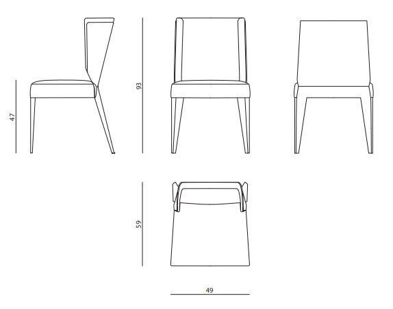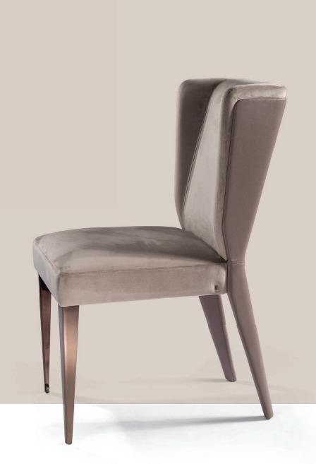 Upholstered chair with structure in wood. Seat and back padded and upholstered in leather or fabric. Rear back and rear legs upholstered in leather, front legs in stainless steel.