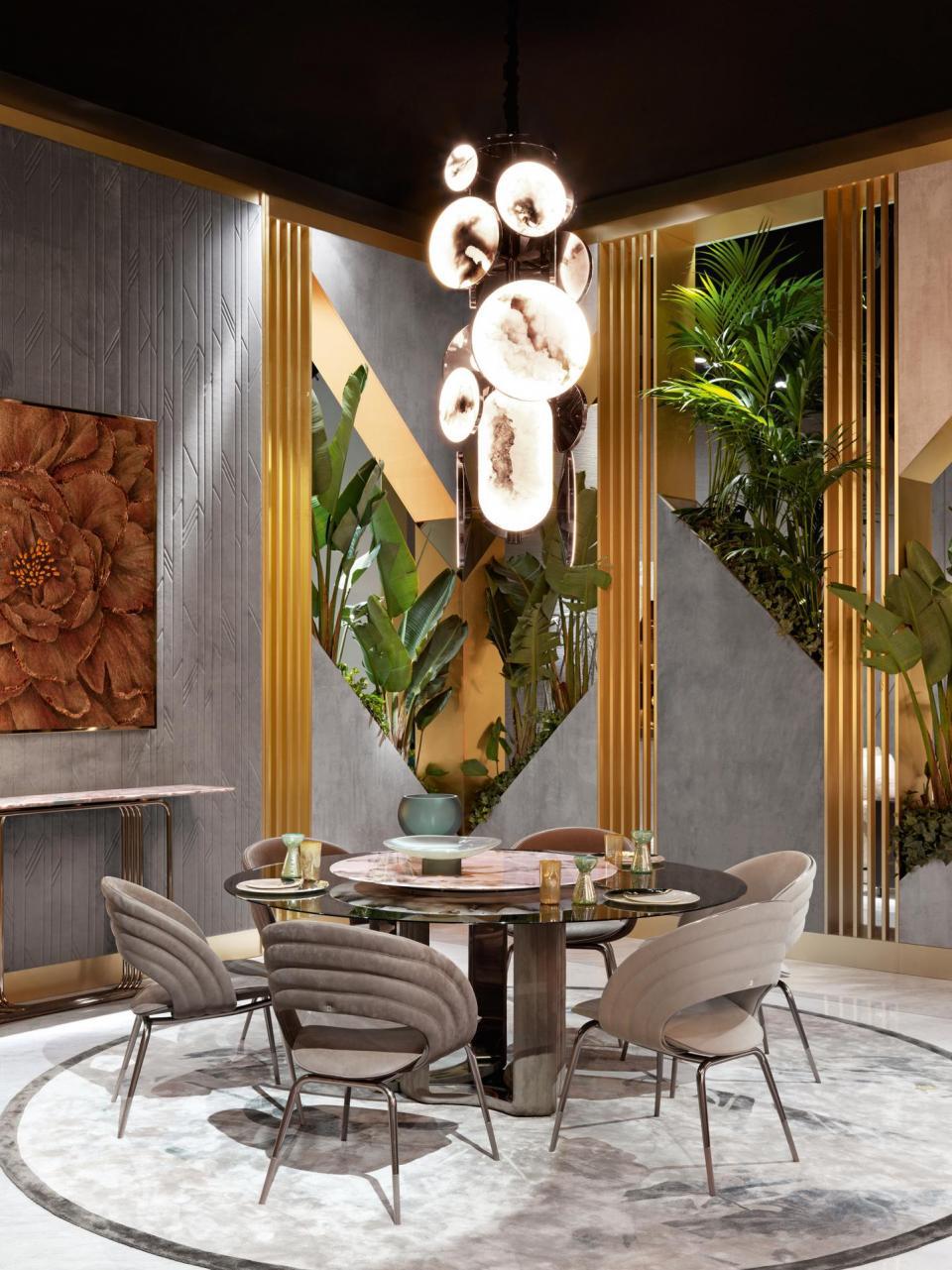 Round glass dining table with Lazy Susan in marble. Metal legs with quilted upholstery in leather or fabric, internally coated in stainless steel.