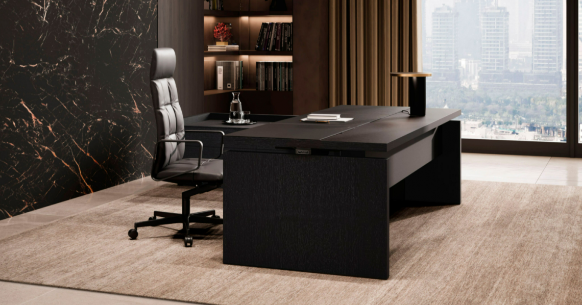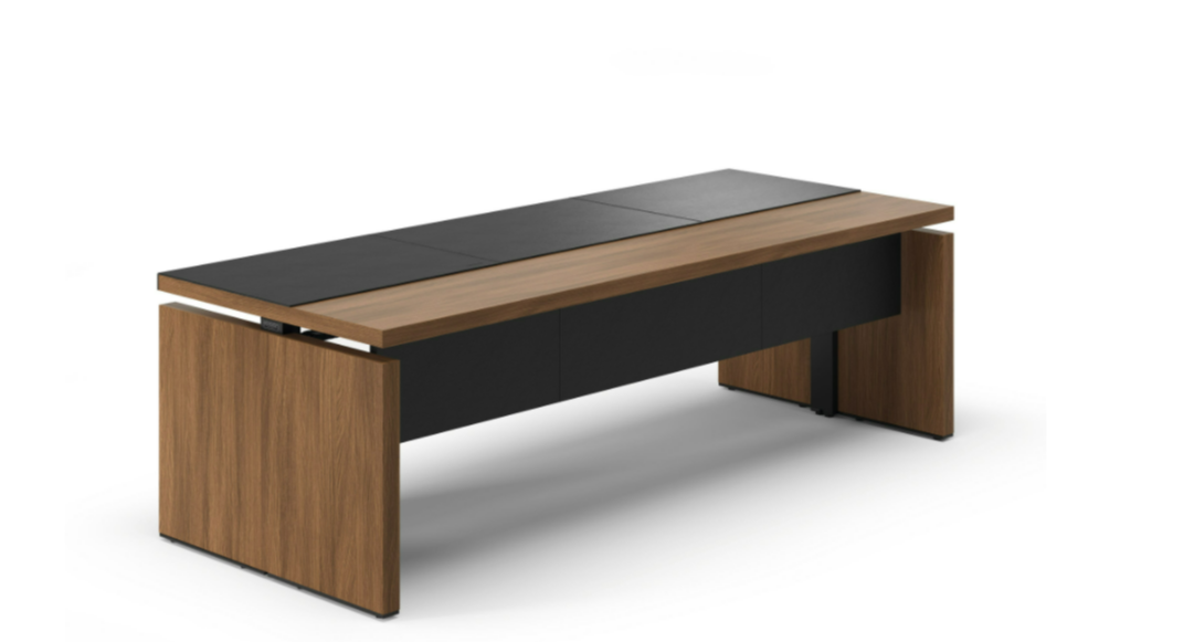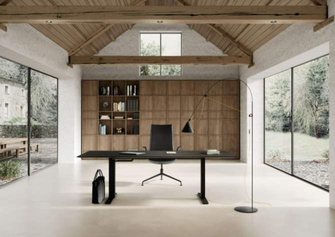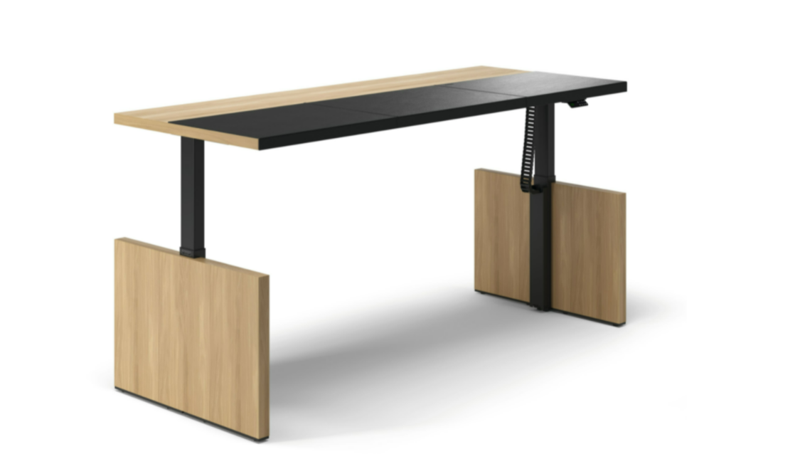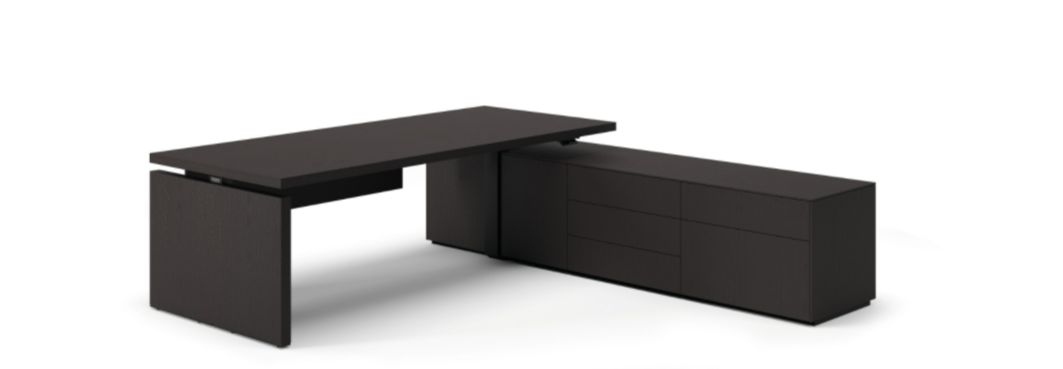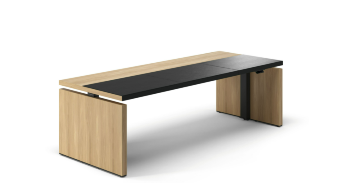 A workbench for leaders: the graphic lines and bridge shape of the executive desk stand for architectural clarity. Projects can be sorted and structured on the large desk top. The height adjustment function allows different positions to be taken at the desk. Valuable and customizable.