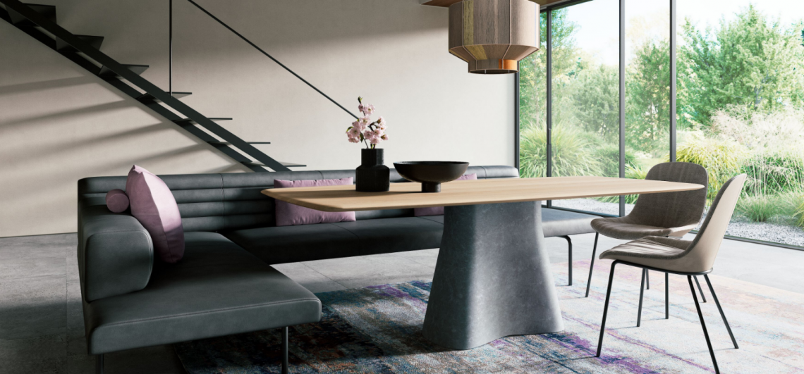 Sculptural strength: Temno Table is a fusion of architecture and sculpture. A table inspired by classical and modern sculpture, made of sensual, natural materials. For an interior design that puts the table center stage.