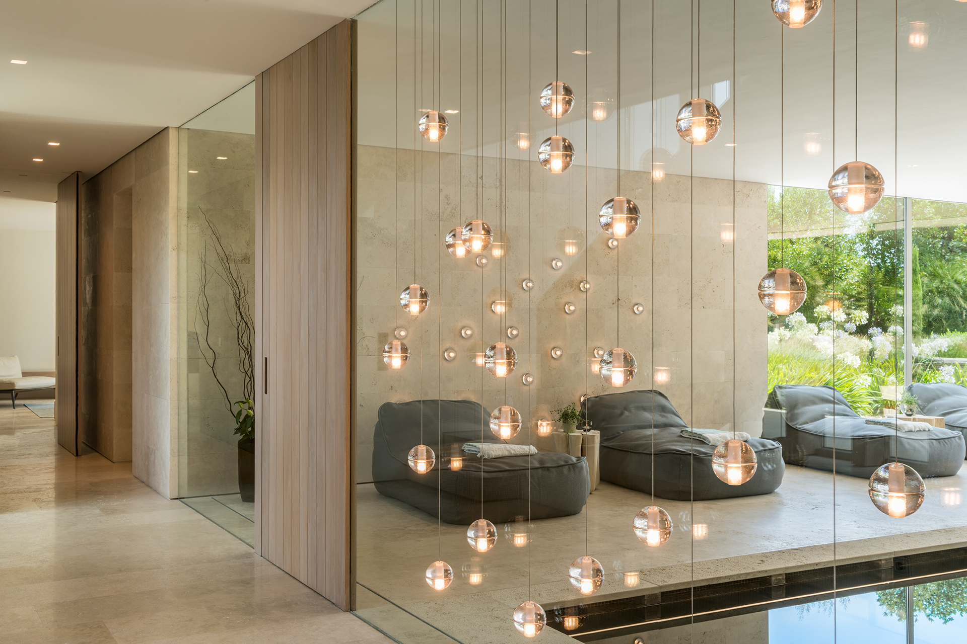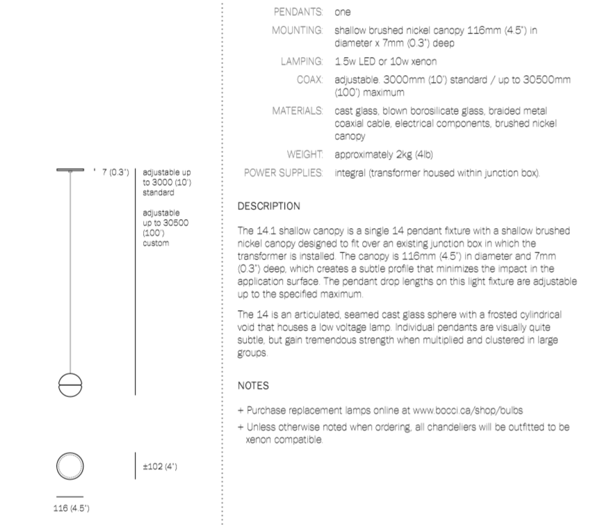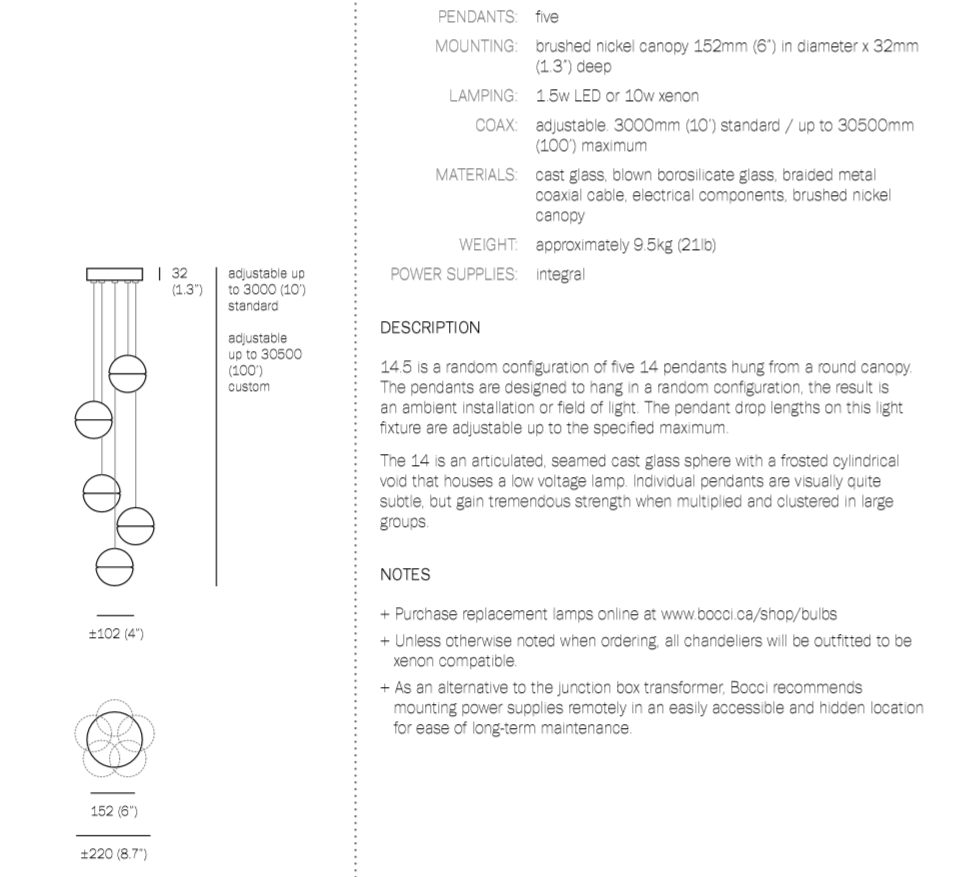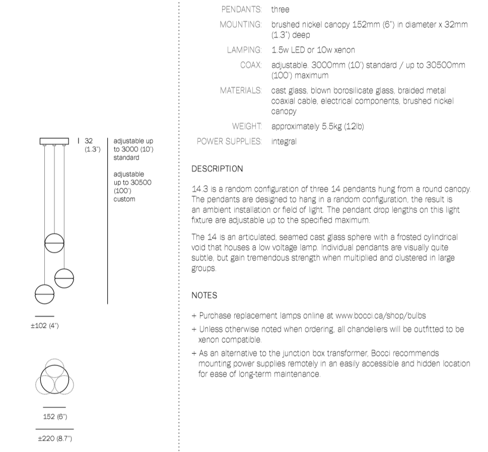 14 is an articulated, cast glass sphere with a frosted cylindrical void that houses either a low-voltage xenon or LED lamp. Individual pendants are visually subtle, but gain an atmospheric quality when multiplied and clustered in groups.
