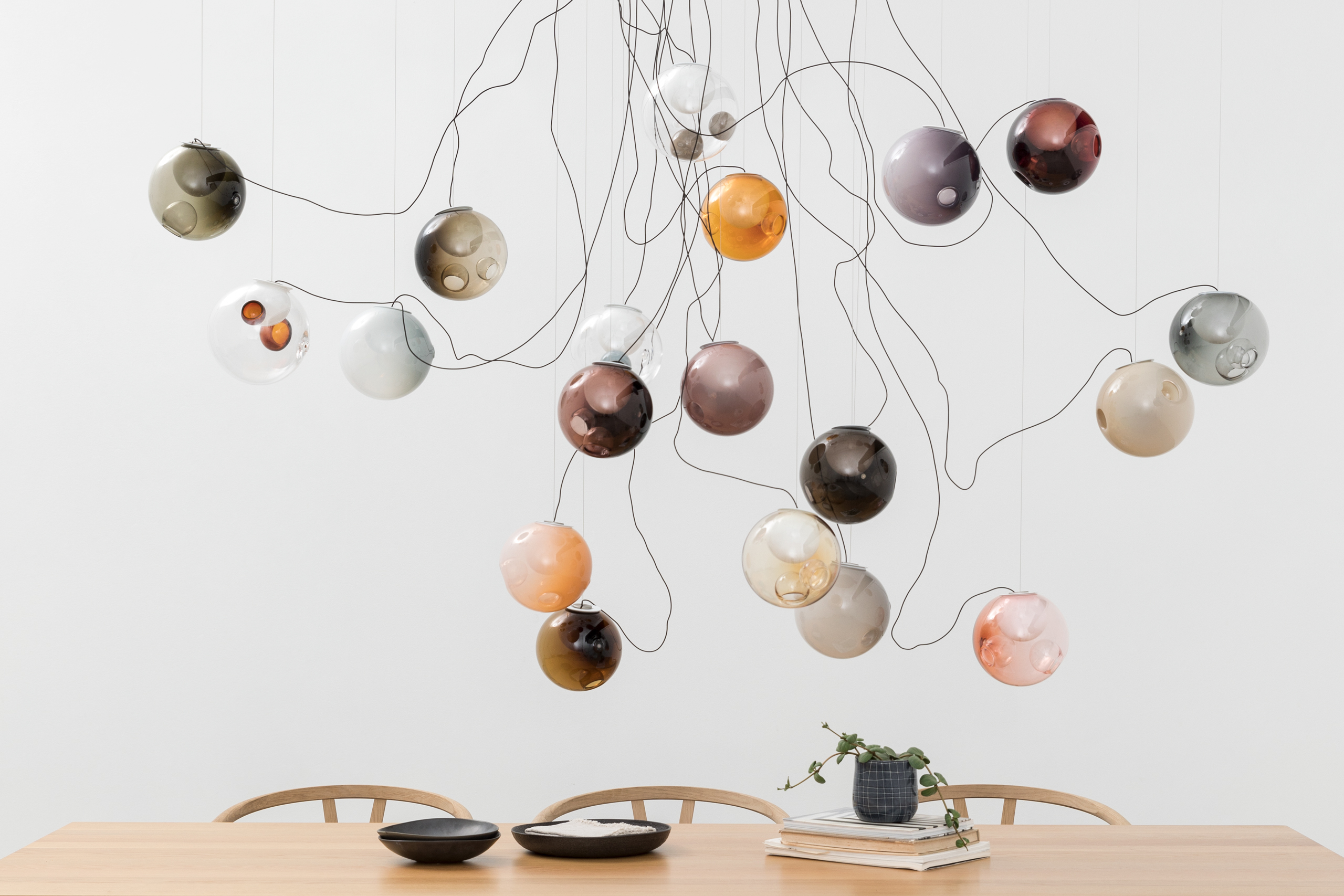 The 28 semi-rigid is a flexible suspension system enables pendants to be nestled in close-knit groups or loosely composed in a wider field, allowing each piece to be perceived individually.