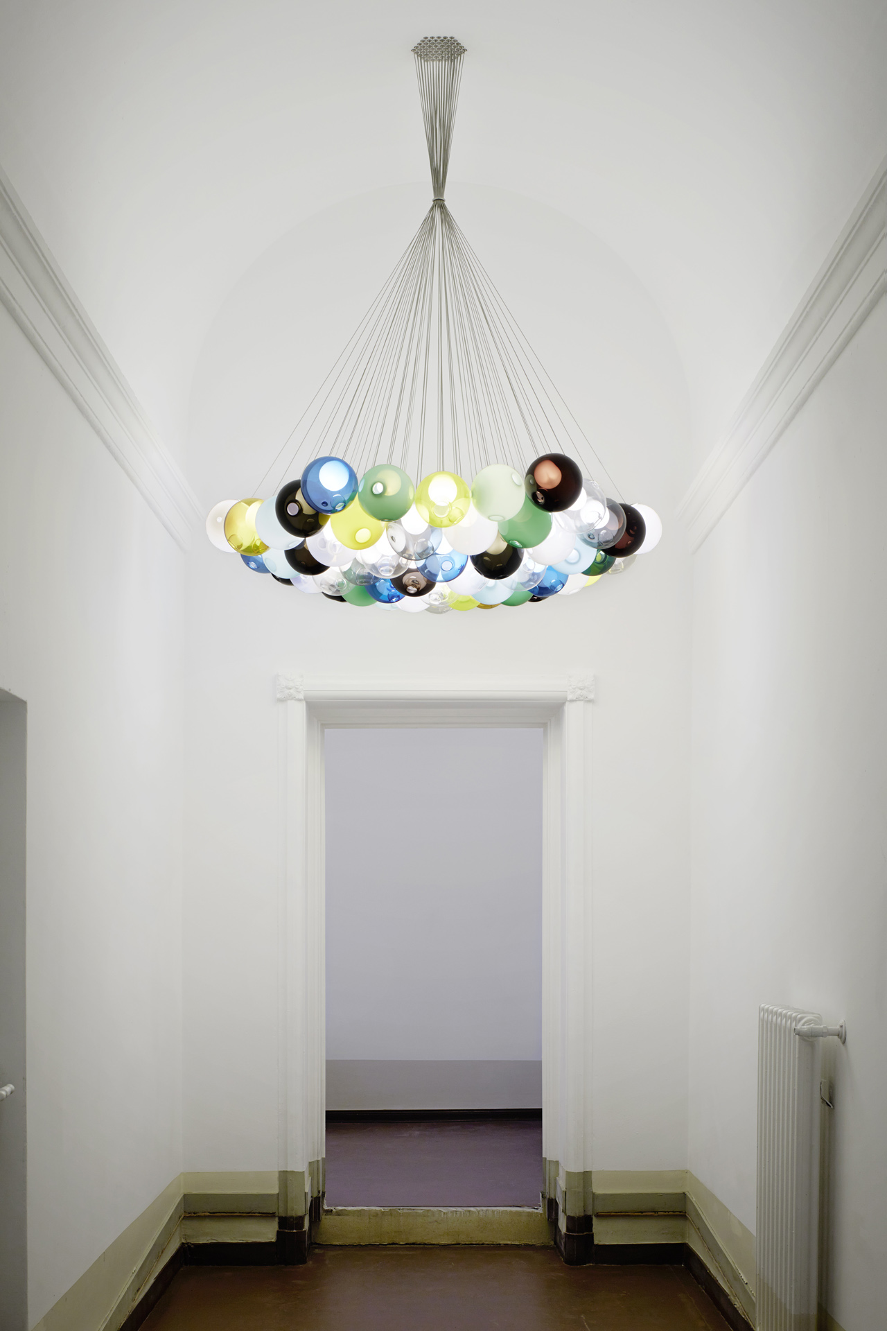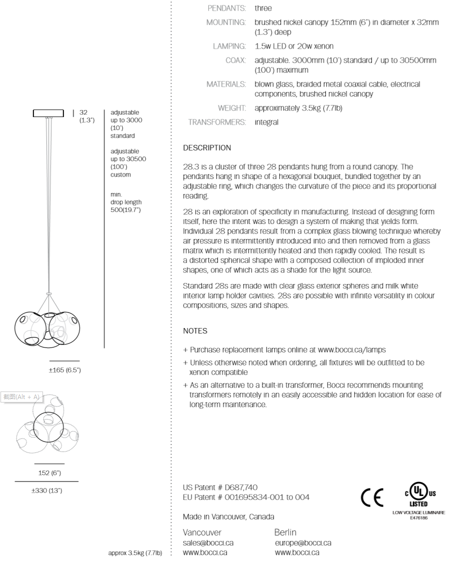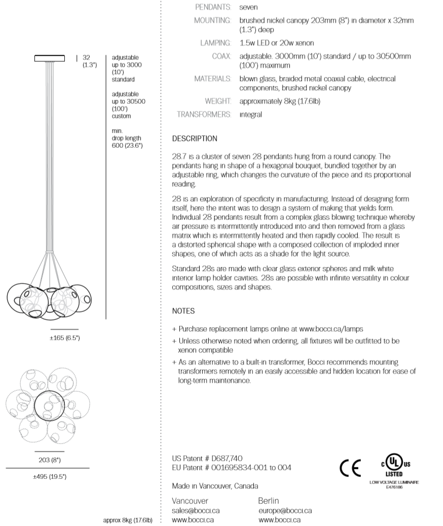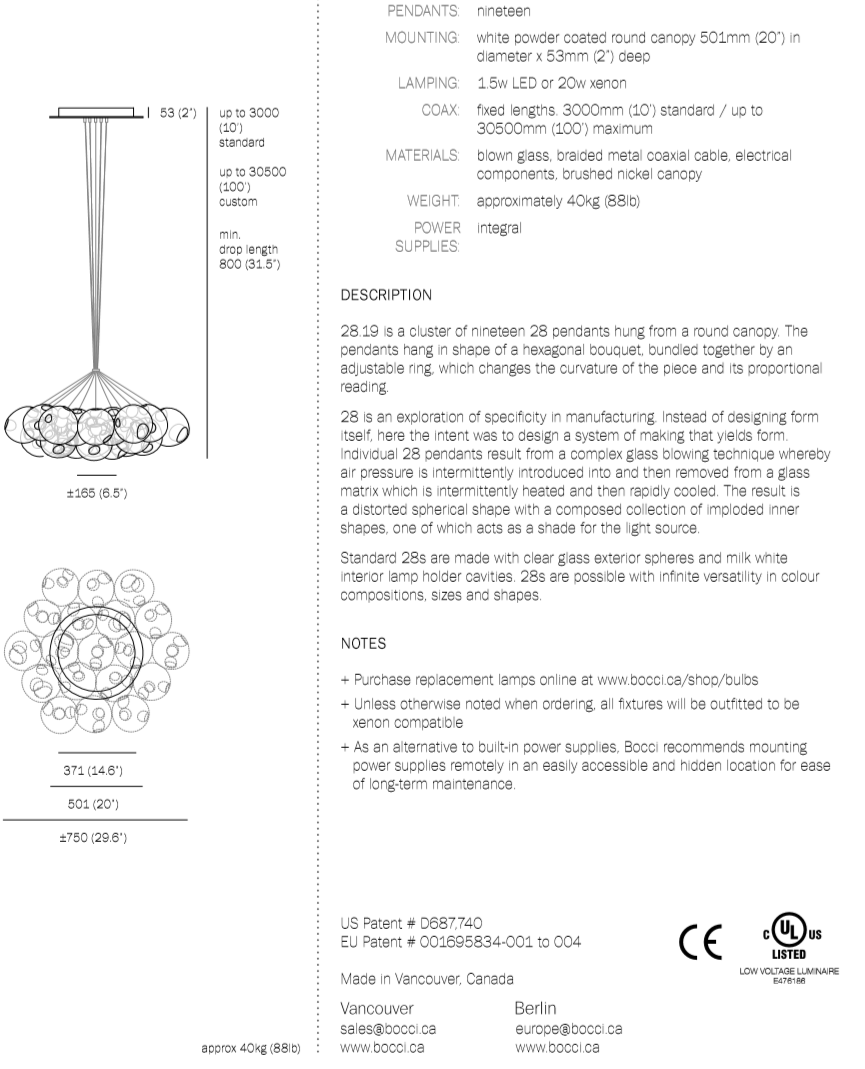 28 Cluster is suspended using coaxial cable and composed in hexagonal clusters in numerous configurations.