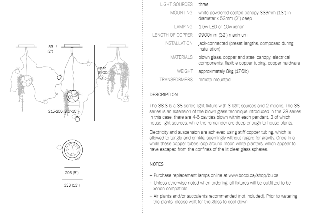 38 pushes the fabrication technique originally developed for 28 to its technical and material limits. A large glass sphere is blown with a multitude of haphazard interior cavities, which intersect and collide with each other in unpredictable ways. Several of these satellite cavities are deep enough to hold earth and succulent or cacti plantings, while others house lighting elements. Each 38 contains two or three lighting elements per large sphere, housing either a 10-watt xenon or a 1.5-watt LED lamp, and one or two planters.