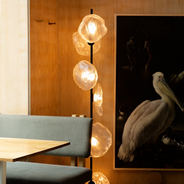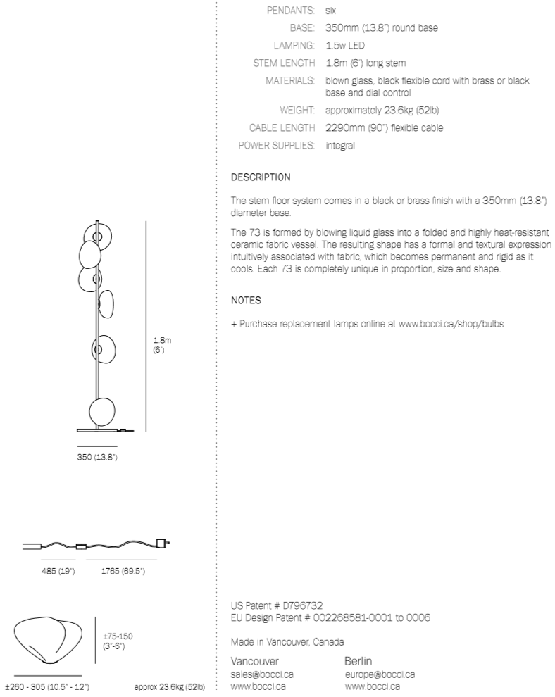The 73 series stem floor system comes in a brass or black finish and three different configurations. The semi-rigid black fabric cord includes a patented integral 360 degree dimming system housed within a sleek brass cylinder.