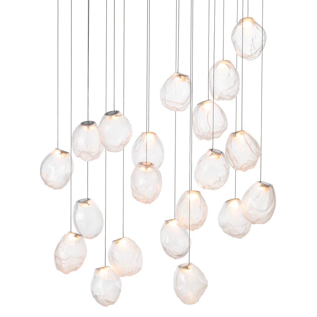 73.20V is a low voltage arrangement of 20 blown-glass pendants. Each pendant is hand blown into a folded and highly heat-resistant ceramic fabric vessel. Each pendant is housed with a 10 watt xenon or 1.5 watt LED lamp.