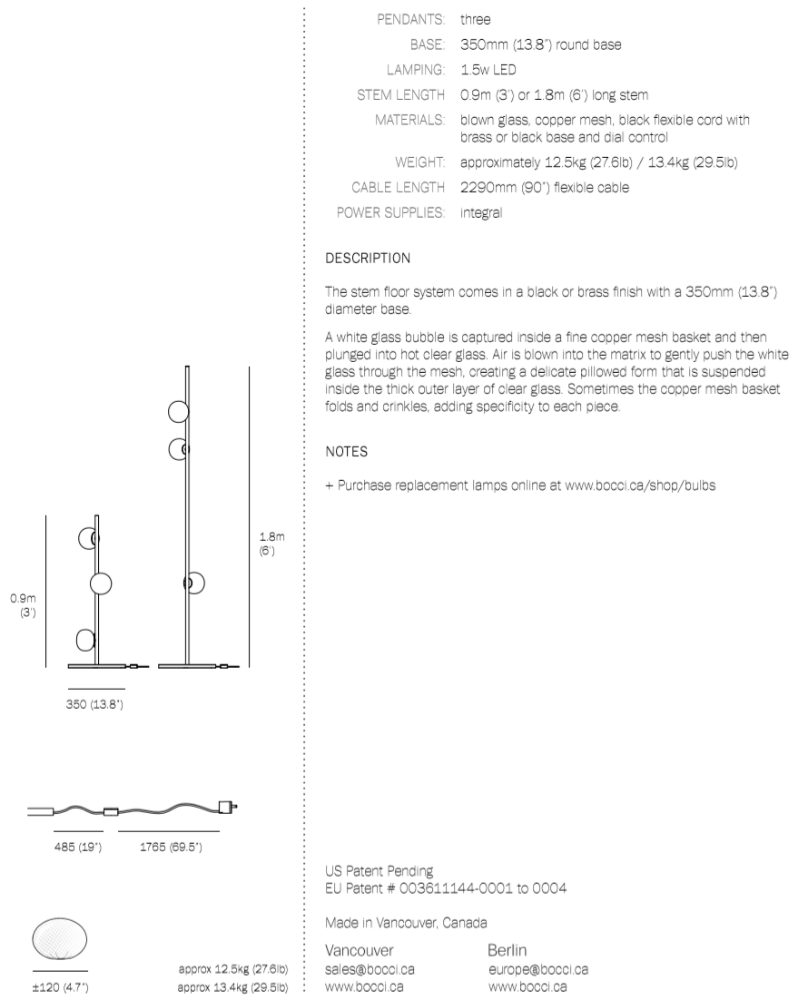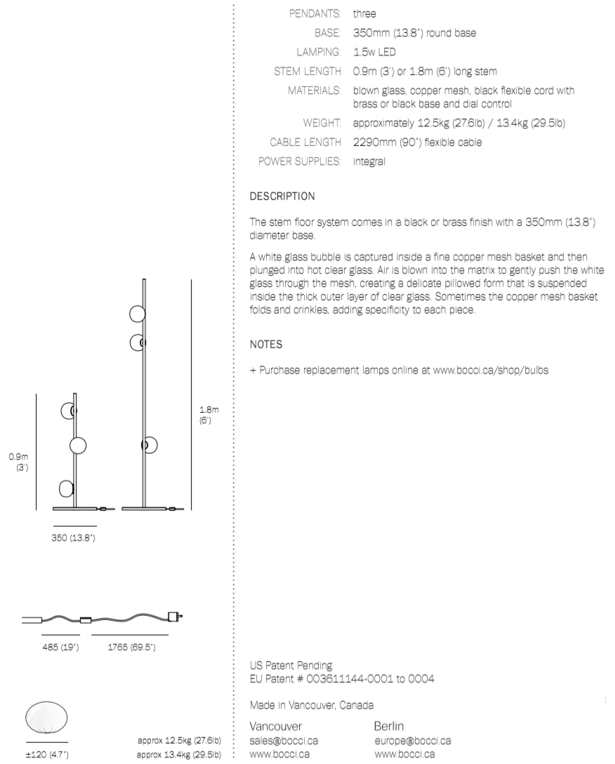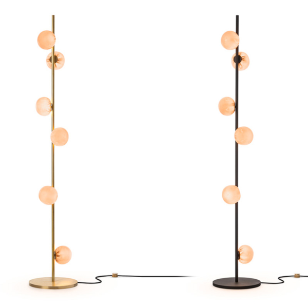 The 84 series stem floor system comes in a brass or black finish and three different configurations. The semi-rigid black fabric cord includes a patented integral 360 degree dimming system housed within a sleek brass cylinder.