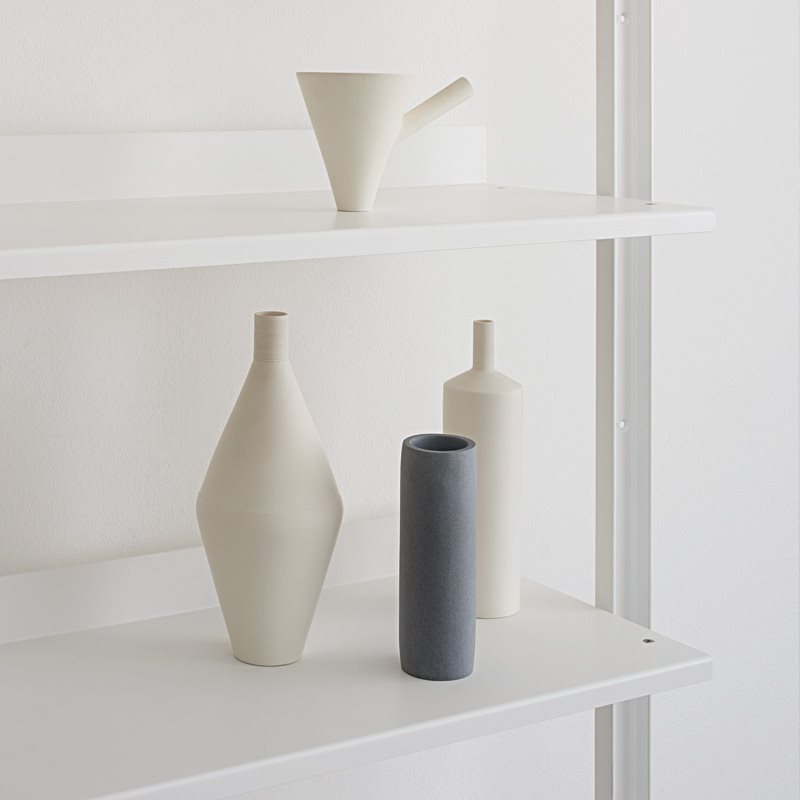 Geometric purity and simple lines in this bookcase standing on bare, light steel uprights which lend an almost ethereal look.Modular bookcase system with drawn-steel uprights available in two versions: upright with wall fixing and floor/ceiling upright. Shelves in metal plate or grey Europa glass. Storage unit with frame and drop-leaf door in lacquered MDF.