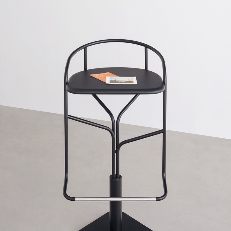 It’s the oriental inspiration from the art of ikebana that we find in Victor Vasilev's Ike stool with its striking contrast of nature's luxuriance and the simple, severe forms in which it is contained. The base is a steel plate topped by a simple support from which round tubes emerge like climbing plants to hold the seat. Stacking chair of tubular steel. Seat and backrest in polyurethane.The IKE collection, exception made for the swivel stool, is also available for outdoor. Fix or swivel stool with steel base and tubular steel frame. Available in two different heights, with polyurethane seat.