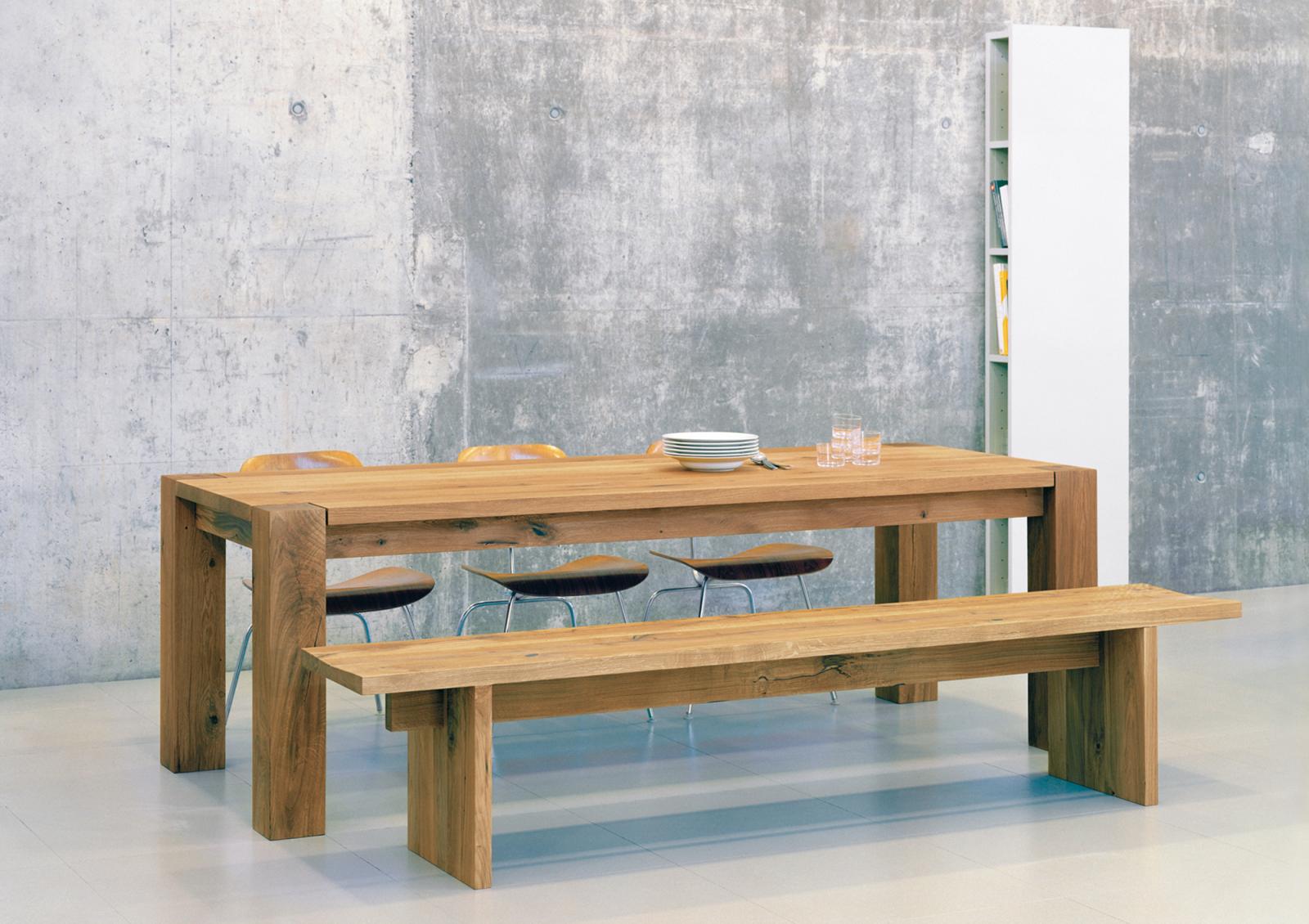The sides of bench TARO are pushed slightly inward to enhance stability, therefore this bench can be offered in a standard length of up to 3600 MM (141 3/4 INCH). The wood is 40 MM (1 5/8 INCH) thick and the top tapers toward the middle for comfortable sitting. This bench, with its clean lines is made of three boards and works well in combination with the tables BIGFOOT? and JAPAN. TARO is delivered as on piece.
