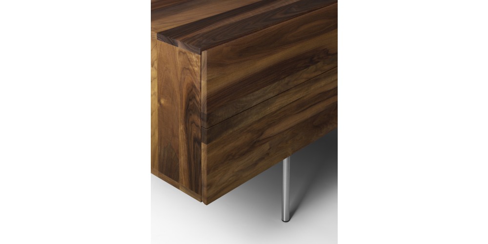 Chest of drawers MAHNAZ is the wall-mounted adaption of the sideboard FATIMA. Even its body is made of solid wood, the sideboard floats effortlessly. The clear design of MAHNAZ benefits from a concept that eliminates visible frames and excludes all unnecessary and obtrusive elements. MAHNAZ can be combined the bar cabinet ARAQ and open shelf DARA.