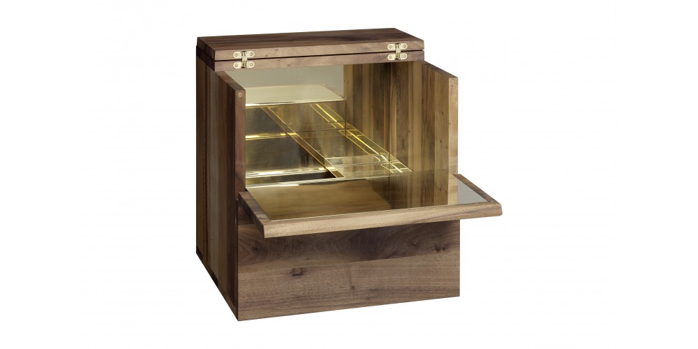The bar cabinet ARAQ is a concealed treasure and delightful surprise when opened. Designed as a complementing module for the solid wood sideboard series SHAHNAZ and MAHNAZ, ARAQ folds open with two hatches, with one hatch also acting as a work surface when the cabinet is opened. The bar interior is fitted with a polished brass or stainless steel inlay.