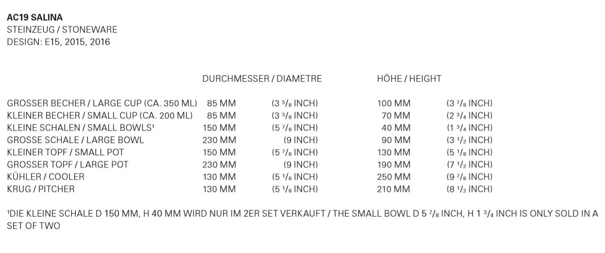 The small SALINA bowl and the small cups are only available as sets of two pieces. SALINA is also available at the e15 online shop.