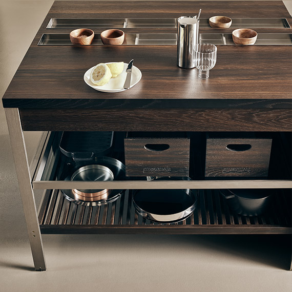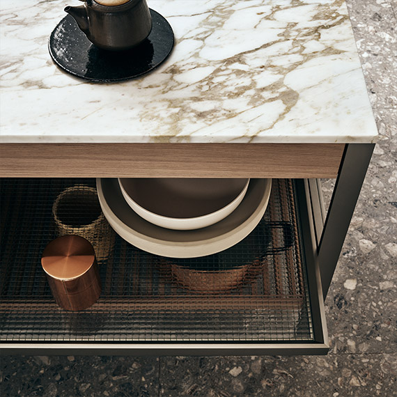 由立式鋼柱組成的模塊化開放系統(tǒng),這些鋼柱水平鋁型材和背面板相連,背面板可定制為與門相同的飾面。此結(jié)構(gòu)可配備拉出式配件和擱板。