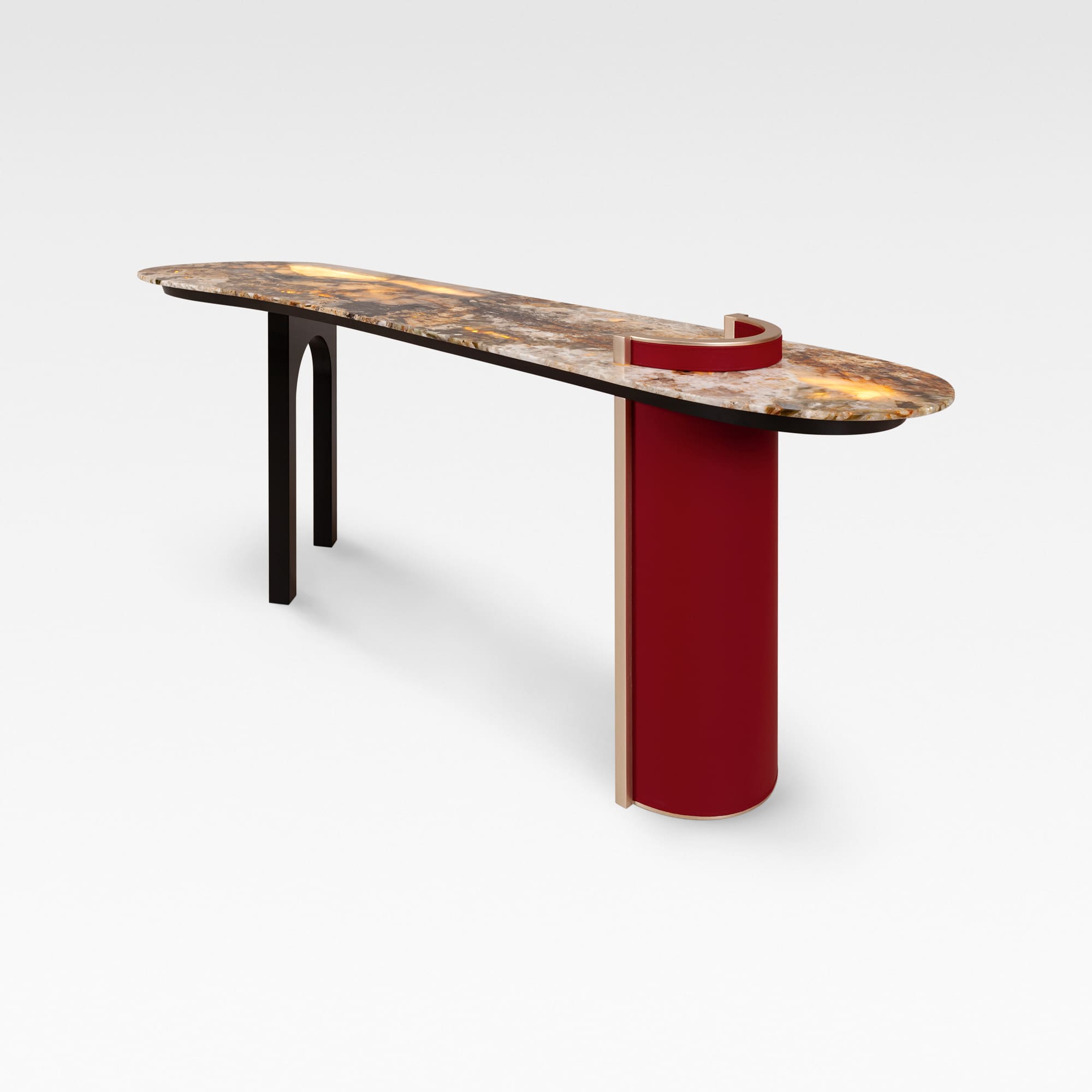 The Chiado quartz console table draws inspiration from Lisbon’s historic quarter, capturing the essence of its artistic life and bohemian spirit. Seamlessly combining contemporary elegance with luxurious materials, Chiado features one leg upholstered in high-quality Italian leather, while the top is crafted from exquisite stone. Designed to exceed all expectations, the Chiado quartz console table accents any interior with its natural artistic expression.