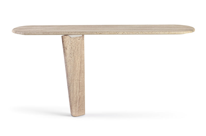 Il tratto distintivo del design di Giorgio Bonaguro è la ricerca di nuovi materiali e la contaminazione tra arti diverse, per uno stile caratterizzato da linee semplici ed eleganti. La console Monroy incarna appieno la peculiarità del designer per forme eleganti e allo stesso tempo solo apparentemente semplici, per una console inaspettata con una sola gamba. Il piano e la gamba sono in marmo e la gamba è caratterizzata da un contrasto visivo e materico: sulla parte esterna della gamba in marmo è applicata una lastra di metallo che crea un contrasto cromatico e materico di grande effetto.