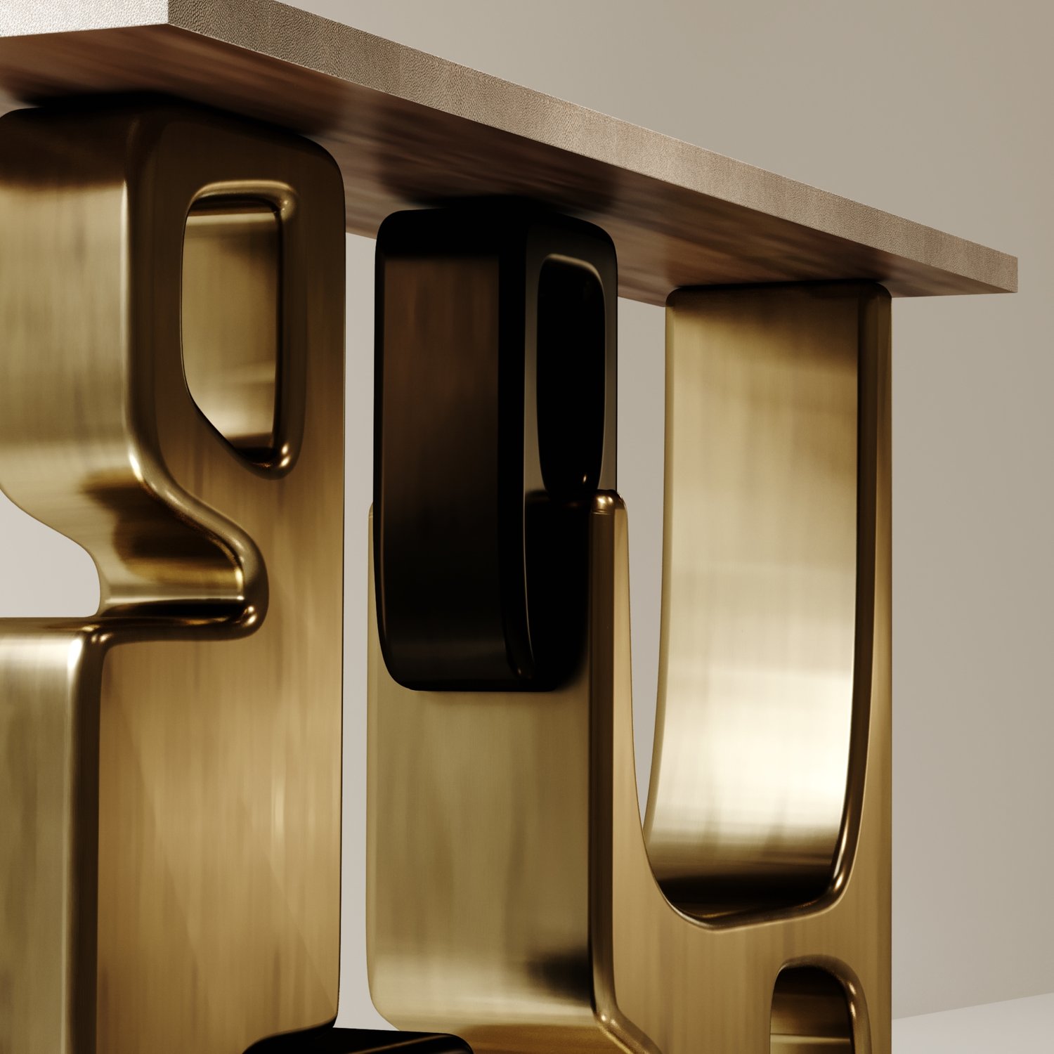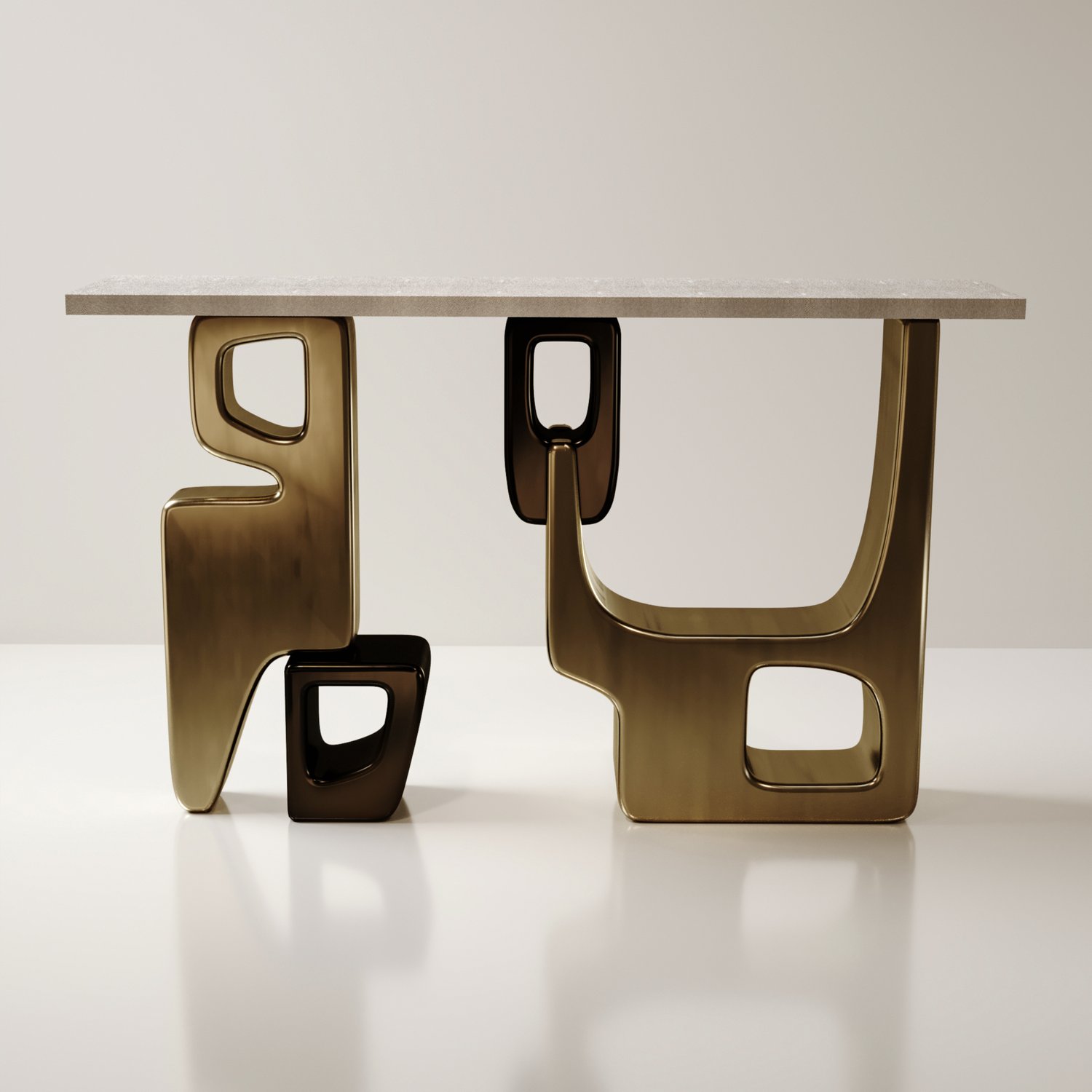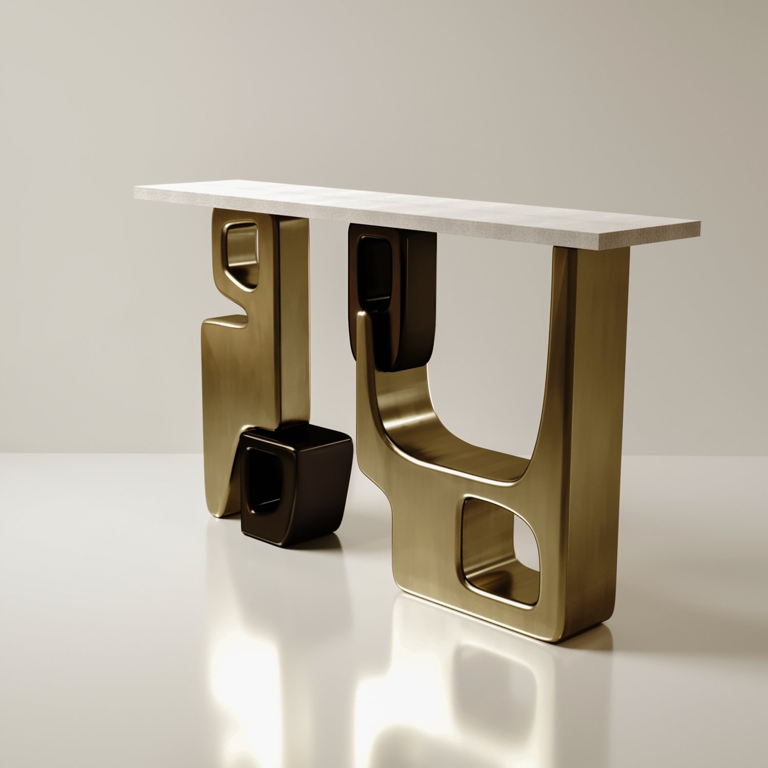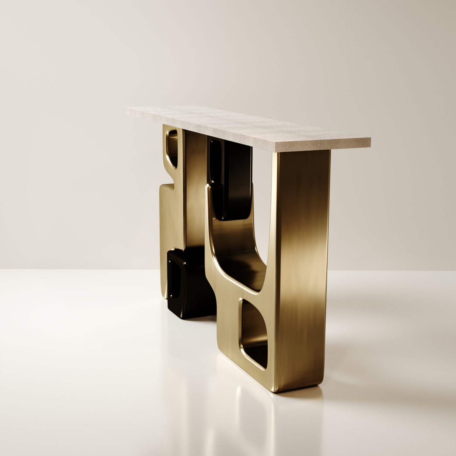 The Apoli console table by Kifu Paris is both dramatic and organic it’s unique design. The cream shagreen inlaid top sits on an ethereal geometric and sculptural bronze-patina brass base. This piece is designed by Kifu Augousti the daughter of Ria and Yiouri Augousti. Part of the Apoli Capsule Series.
