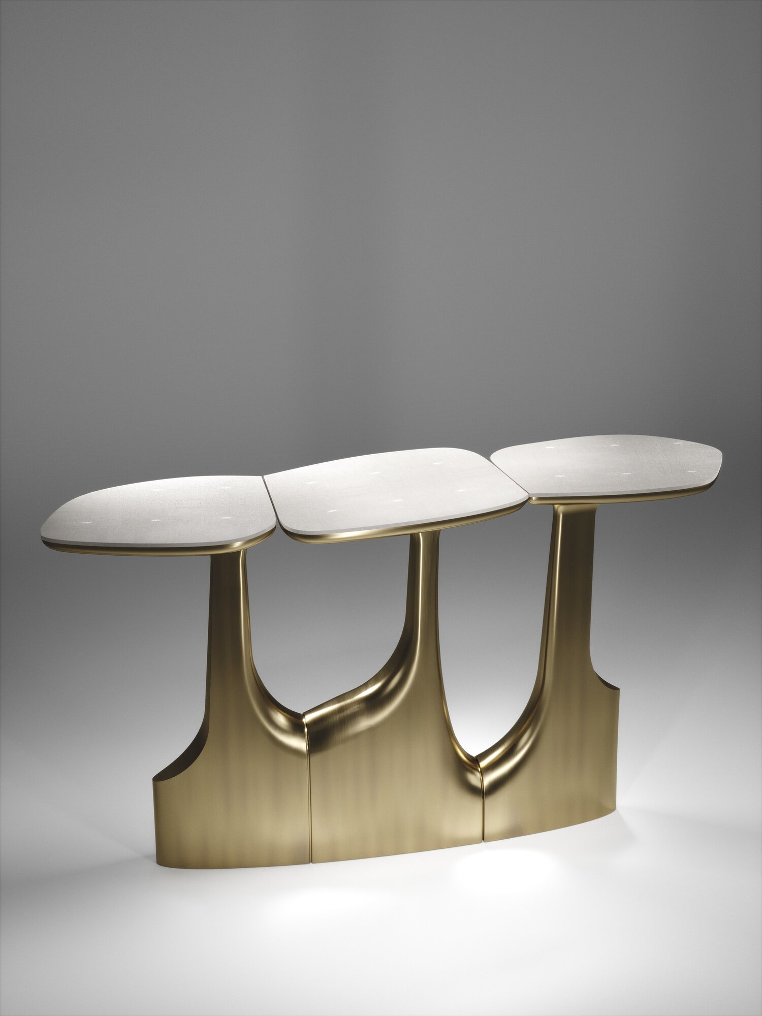 The triptych console table by R&Y Augousti is a stunning multi-faceted sculptural piece. The beautiful hand craved details on the bronze-patina base demonstrate the incredible artisan work of Augousti. The tops are inlaid in cream shagreen. Available in other finishes.
