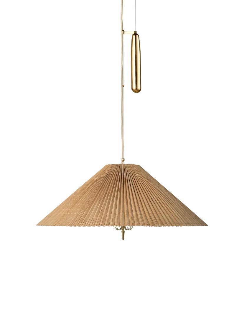 Designed by the legendary Paavo Tynell, the 1972 pendant features a conical shade in bamboo, crafted by master artisans. The the bamboo slats are hand sewn into a pleated mat and fastened by hand to the wire frame, with a linen liner in between. This directs light down towards the base and creates a diffuse glow around the shade and upward, as the bamboo slats are penetrated by the light. Tynell's signature brass details are present as well, adding an air of timelessness and perfectly complementing the warm tone of the wood and light. Below the bulb, a fabric diffuser modulates the light and, beneath this, a decorative brass detail gives each lamp a flourish of character, and subtly influences the play of light it generates.