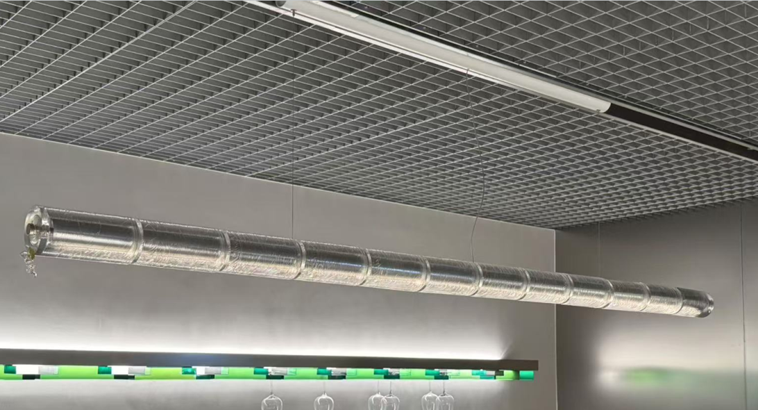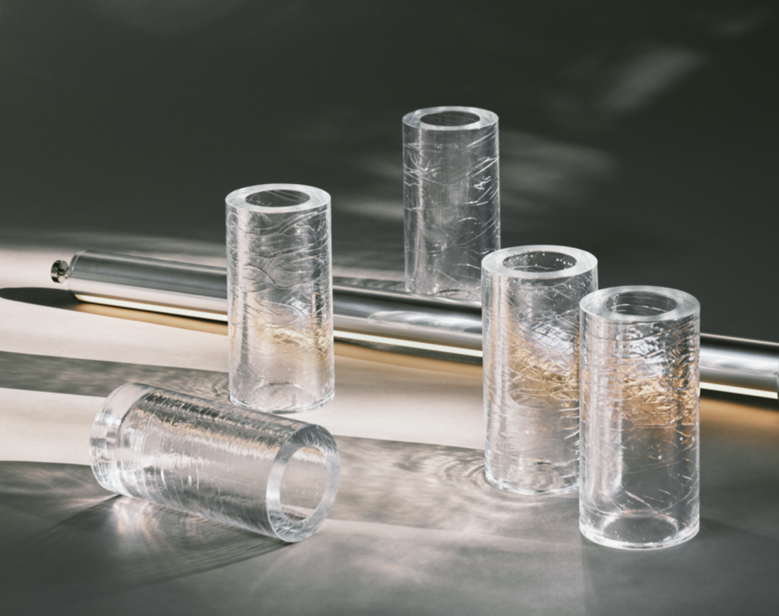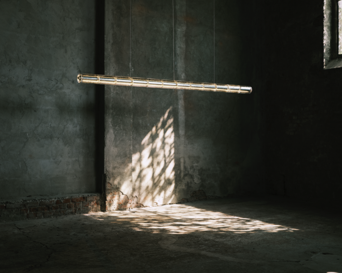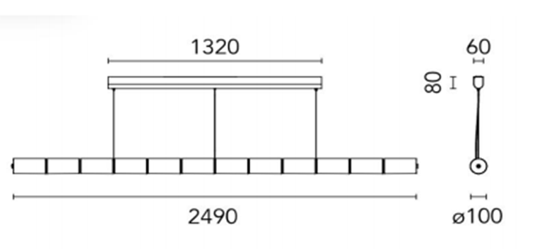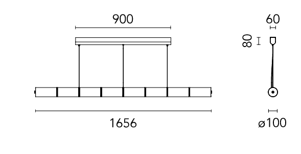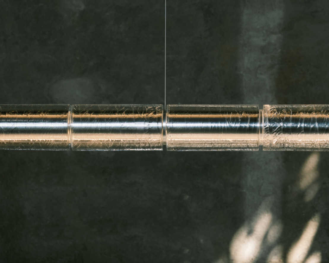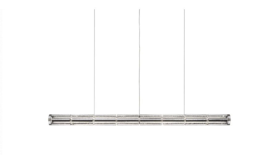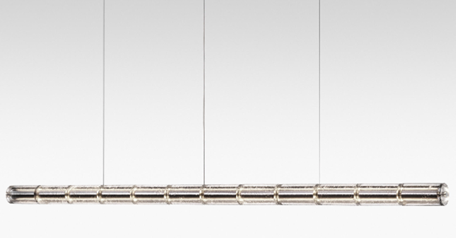 Suspended lamp consisting of interconnected glass modules that reach a length of 1.66 mt. (S1) 2.07 mt. (S2) 2.49 mt. (S3) with 2.70 m suspended power cable.The cylindrical transparent glass modules are created through an artisanal process by pouring the glass into a rotating mold to obtain an exclusive finish that makes each single piece unique. Internal structure in polished extruded aluminum equipped with two linear LED modules for direct and indirect lighting downwards. The modules can be easily removed and replaced in case of maintenance.
