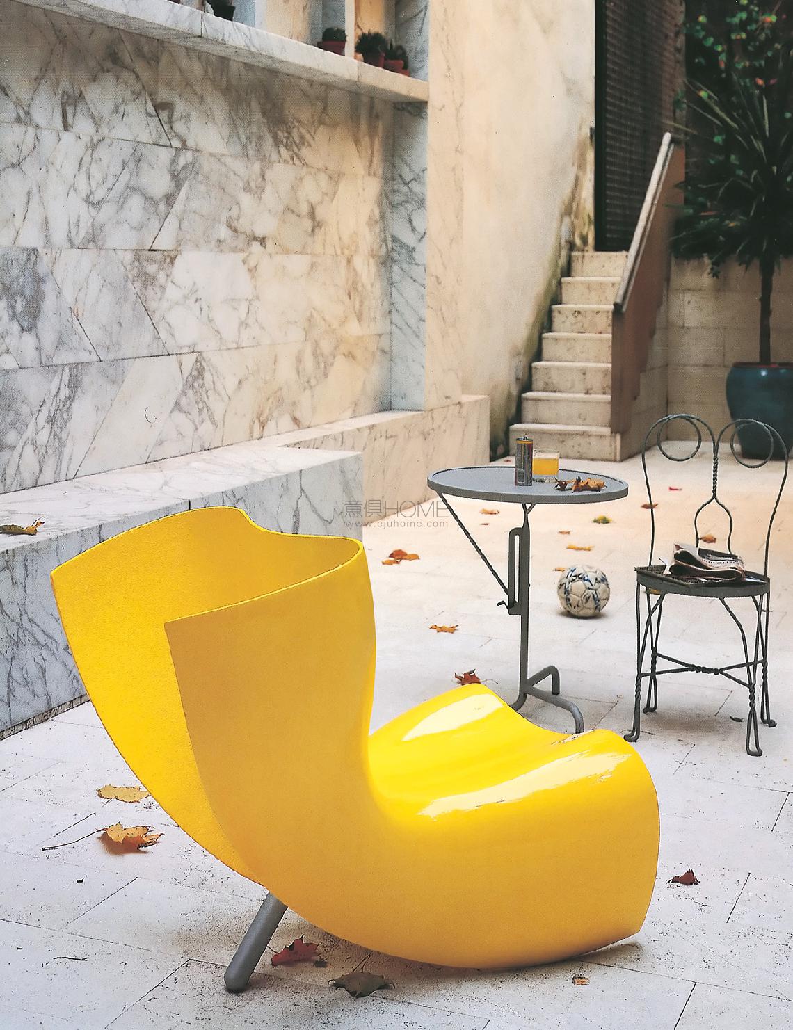 An explosion of vitality: Felt Chair by Marc Newson has a reinforced fibreglass shell that can be varnished with a glossy finish in a vast array of colours: orange, red, blue, white or black. The rear back support is made of natural polished aluminium.