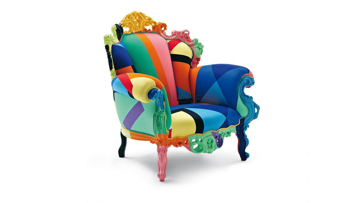 A cult object in the design world, the Proust armchair has been reinterpreted here with a fixed cover made of bright multi-coloured fabric designed by Mendini himself.