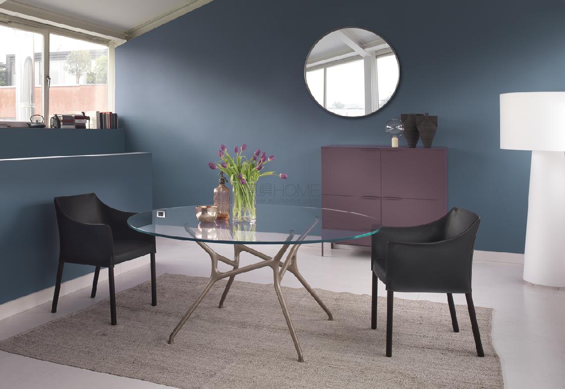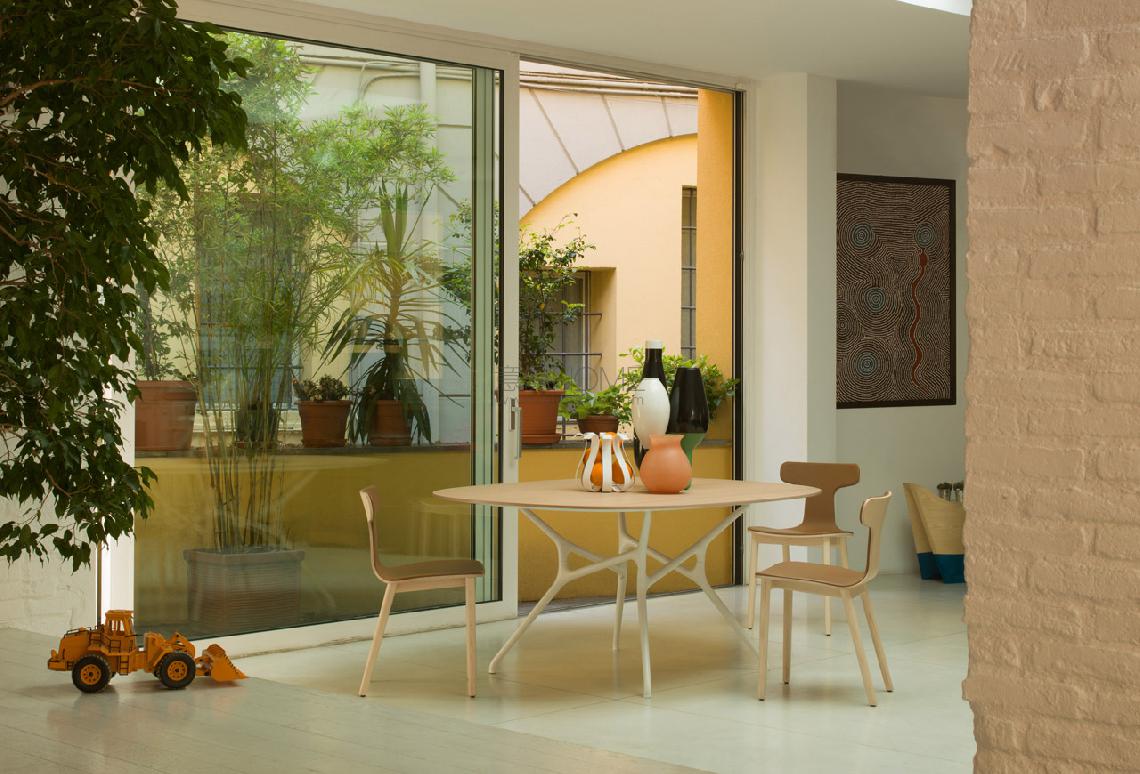 Easy to assemble and suitable for both residential and contract settings, the Branch Table is compact during transport. The table top is available in several versions: extra-light glass; matte lacquered in the colours from the collection; wood (oak with a natural or wengé finish, black canaletto walnut). The base comes with a matte finish, in white, anthracite or mud.
