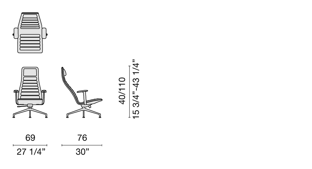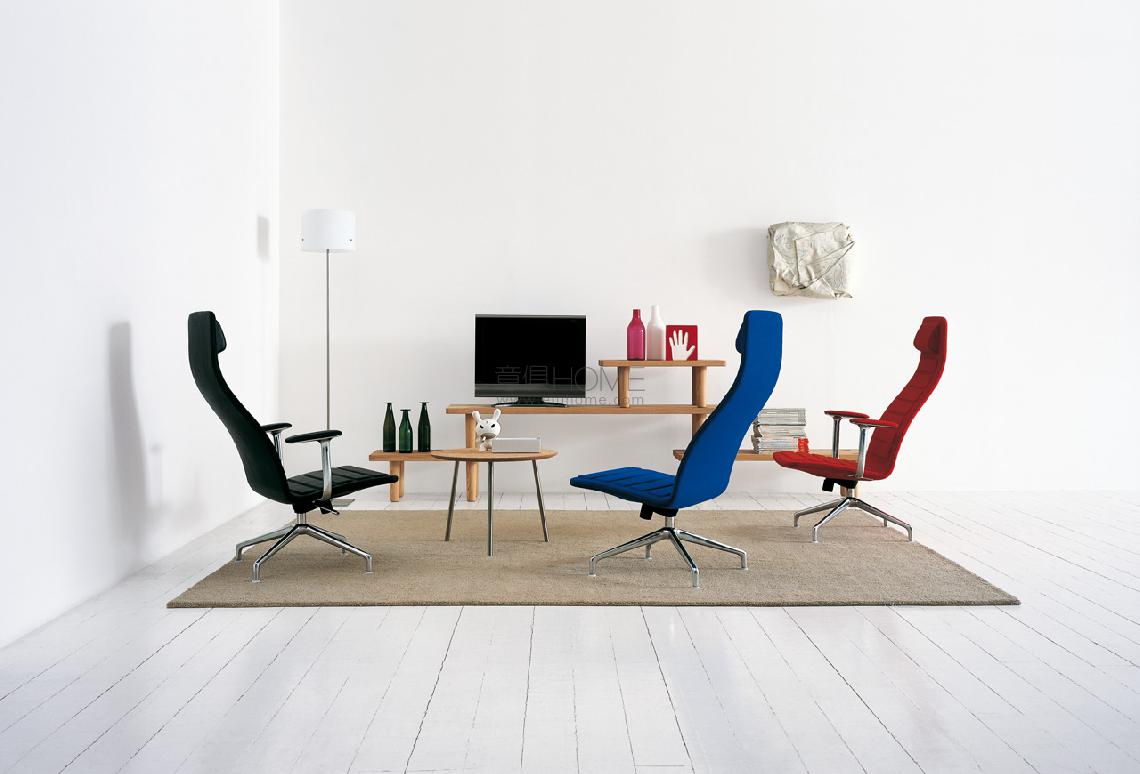 Both swivelling and tilting, the structure of the Lotus (Attesa) is made of beech plywood, with polyurethane foam padding. The base has four spokes and is made of die-cast aluminium with either a polished chrome finish or matte lacquered in white, mud or anthracite.