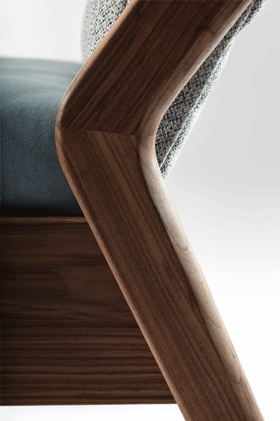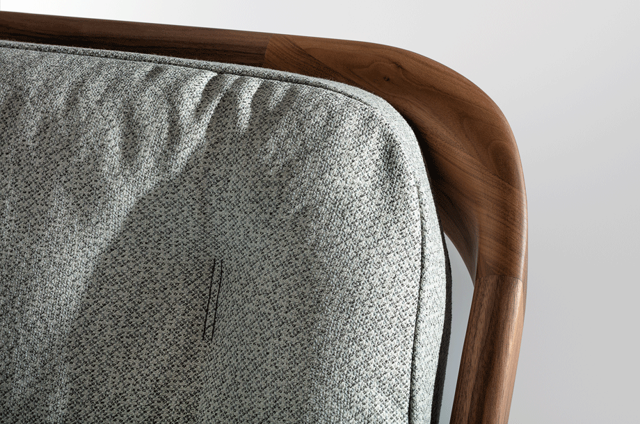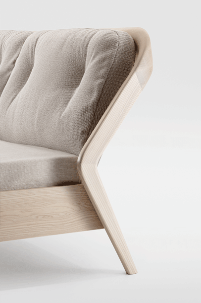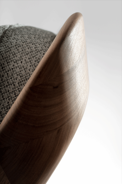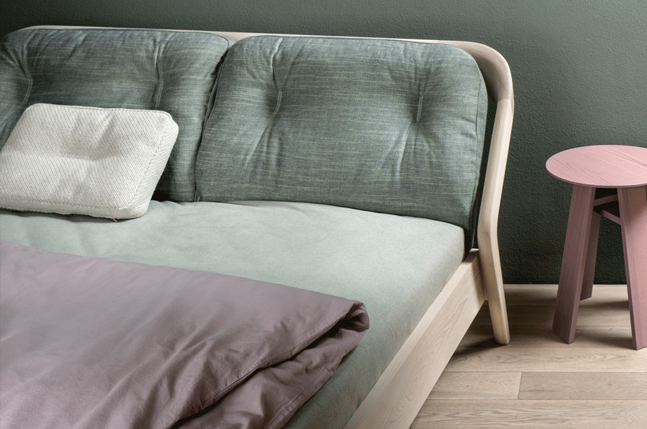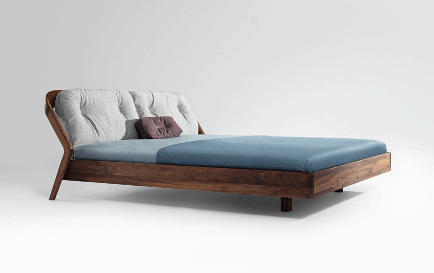 The backrest swings in a gentle arc from the headboard down to the ground. Midway, the elegance of the shape changes – it makes an unforeseen bend and the graceful back becomes a solid foot of the bed. The whole back looks like one piece and despite its solidity, it radiates a casual rest. In contrary, the front part of the bed seems to float in the air, due to the inwardly offset feet.
