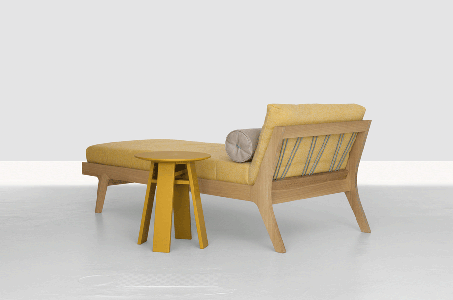 MELLOW DAYBED is a daybed and seating opportunity all at once and also doubles up as chaise longue that invites you to spend time. Its soft back pillow and upholstered roll offer comfort for sitting or reclining alike. Slim material profiles, fine lines, a delicate frame and soft upholstery materials as well as a nifty bend leather cording in the back part are the hallmarks of this daybed.