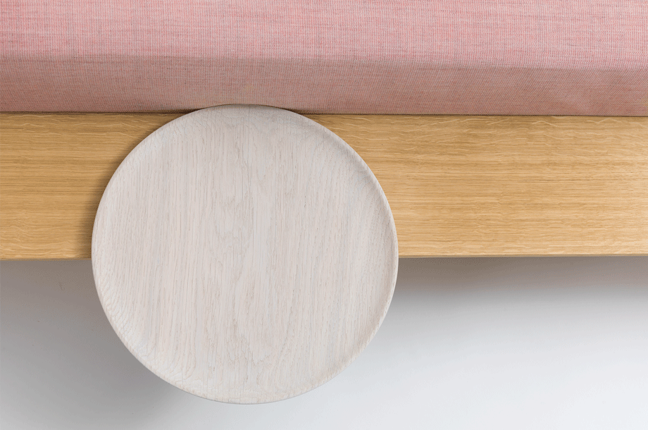 YOMA appears to be floating. The bed stands apart through its low frame. The long side of the bed serves as a shelf, one detail of the craftsmanship is the wave that serves as a wooden connection. Through its rounded corners the bed also appears soft and inviting. The mattress only sinks down a few centimetres; it appears to be lying on top.